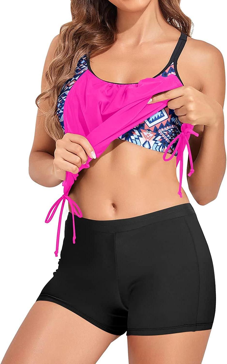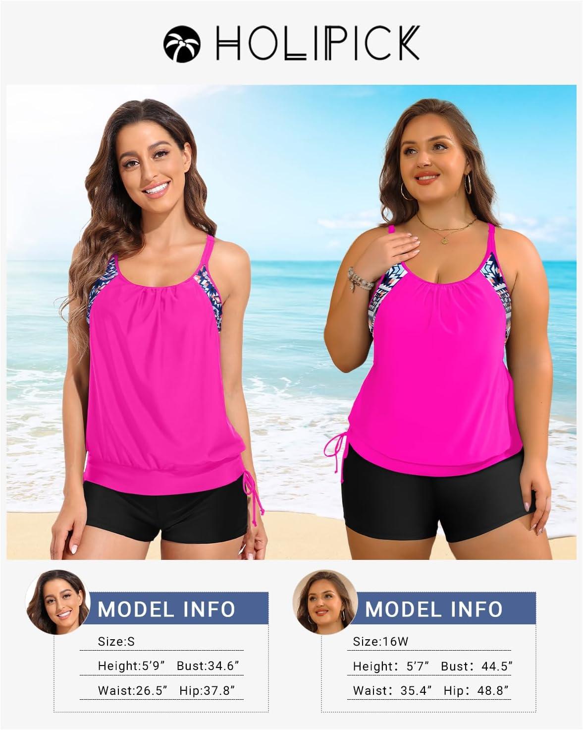 Holipick Blouson Tankini Swimsuits for Women – Two Piece Tummy Control Bathing Suit with Shorts Modest Swimwear(A Hot Pink)