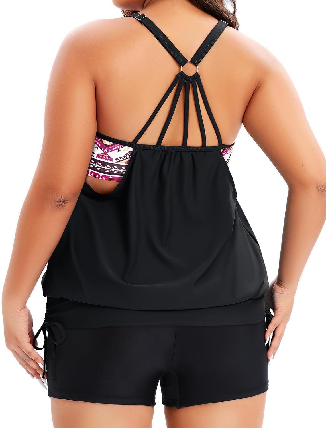 Holipick Blouson Tankini Swimsuits for Women - Two Piece Tummy Control Bathing Suit with Shorts Modest Swimwear(Black Tribal)
