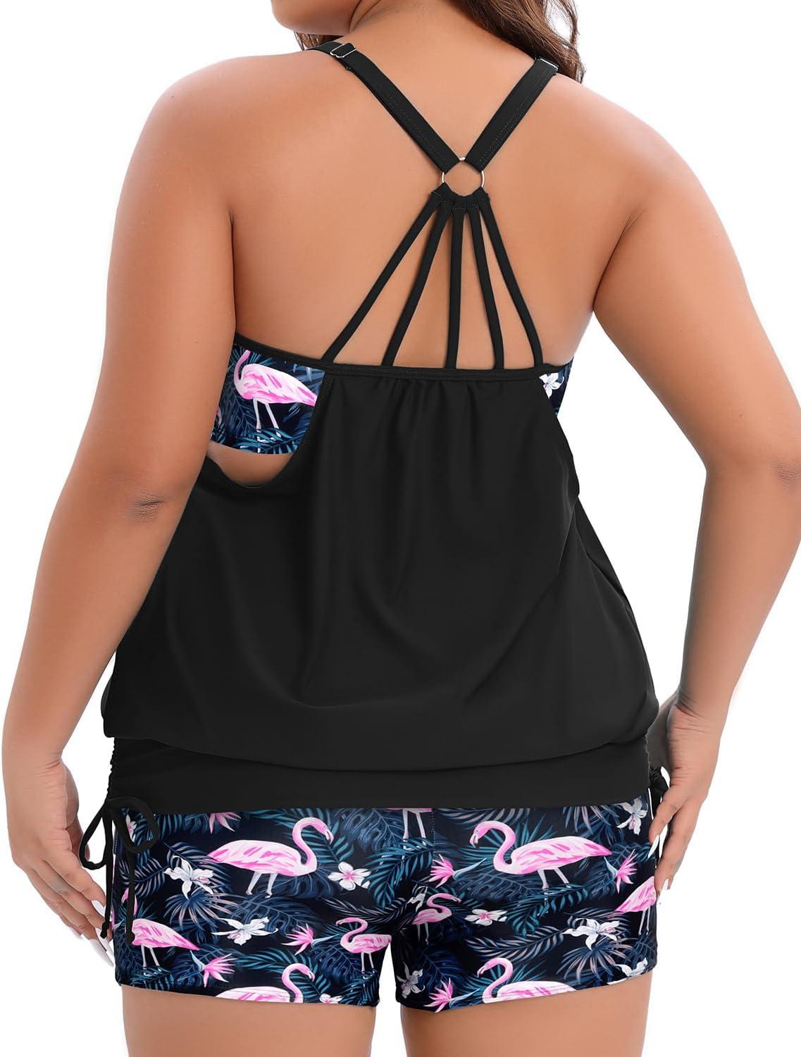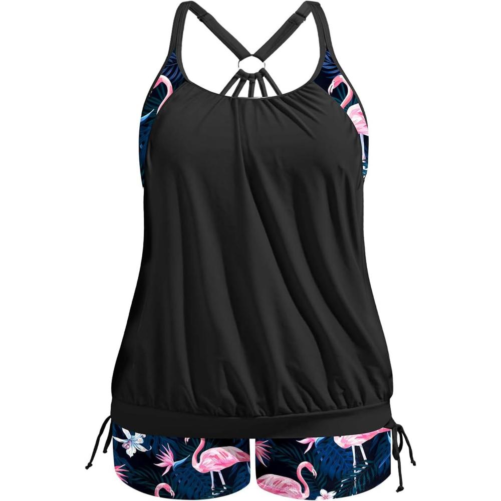 Holipick Blouson Tankini Swimsuits for Women - Two Piece Tummy Control Bathing Suit with Shorts Modest Swimwear(Black With Flamingo)
