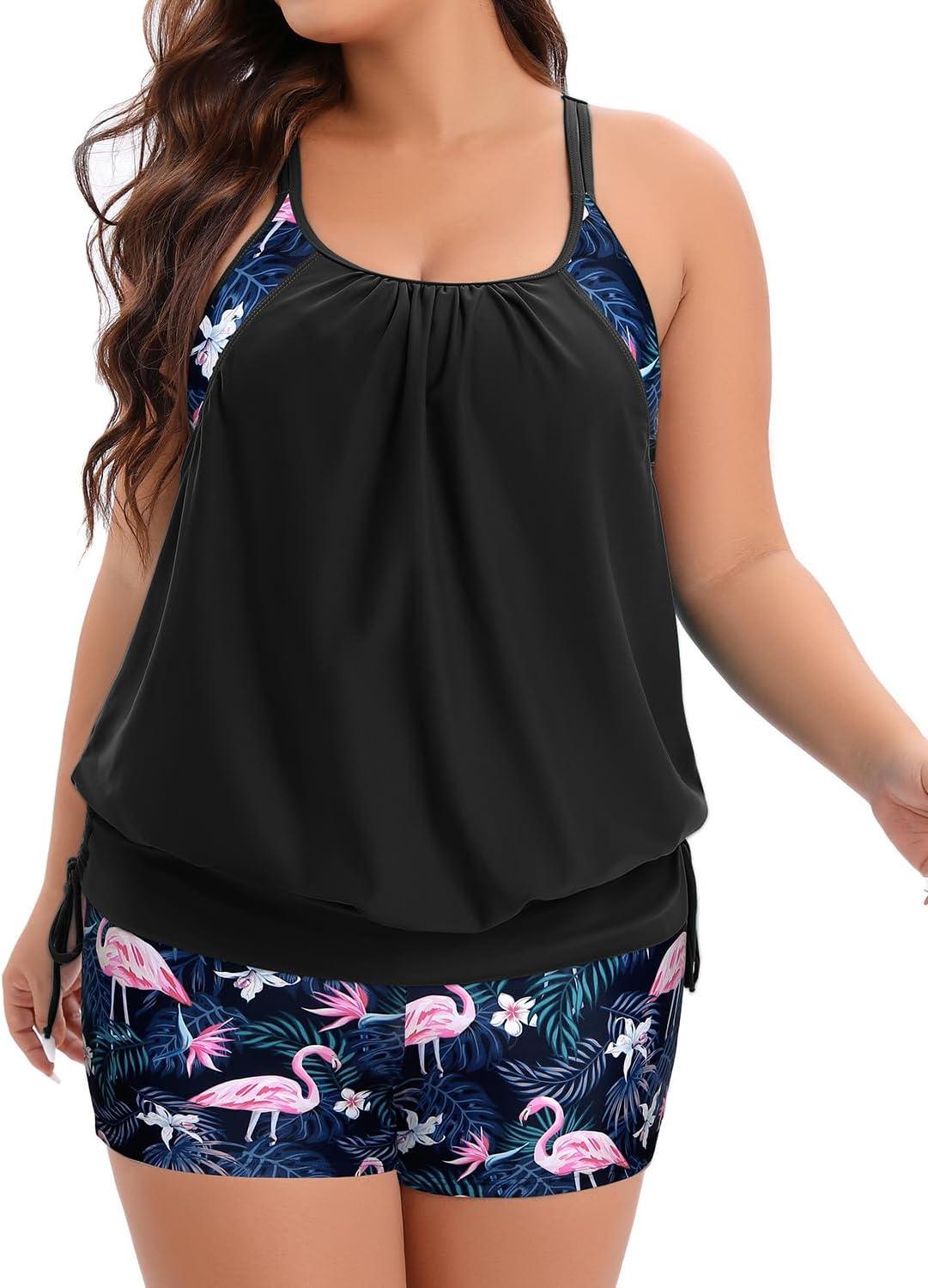 Holipick Blouson Tankini Swimsuits for Women – Two Piece Tummy Control Bathing Suit with Shorts Modest Swimwear(Black With Flamingo)