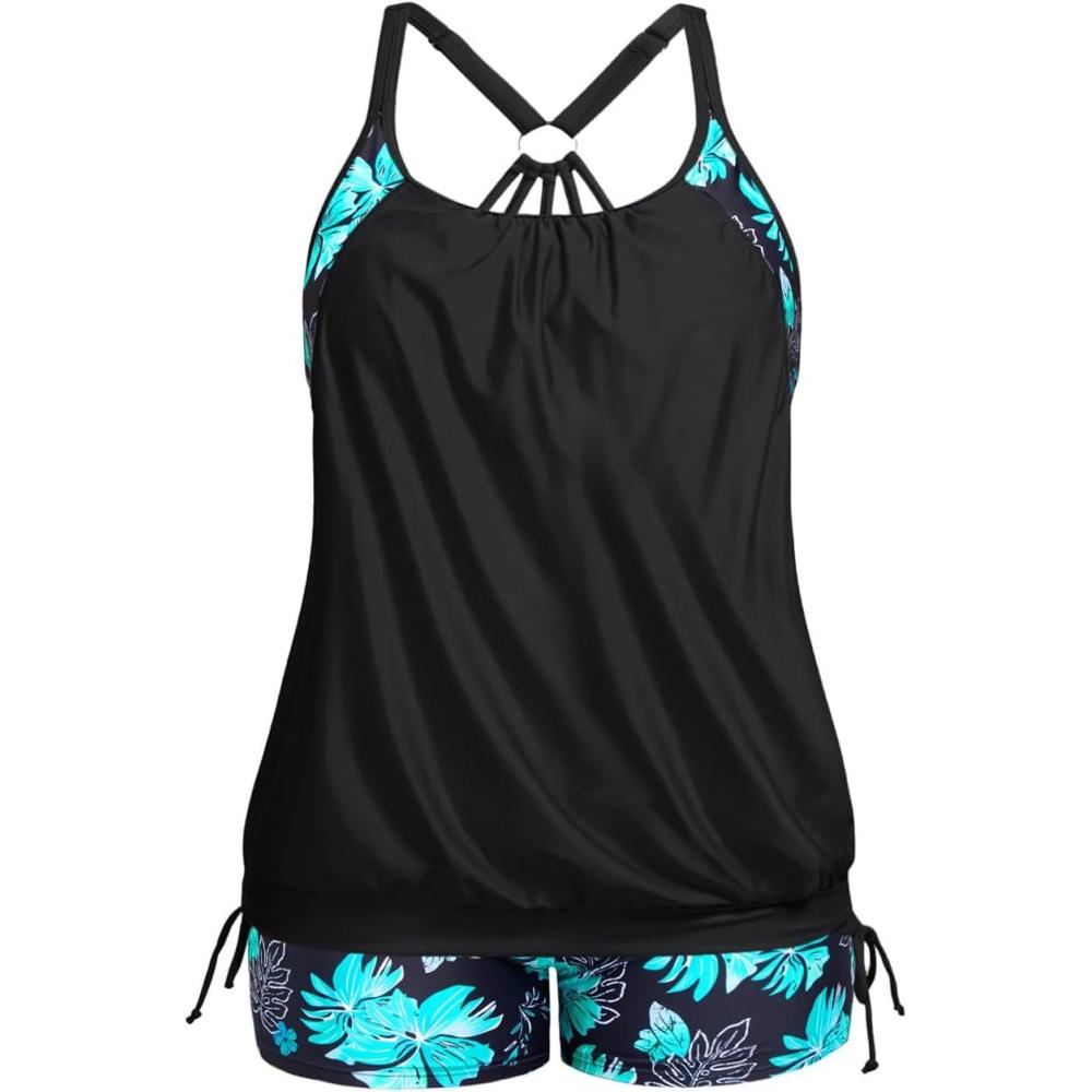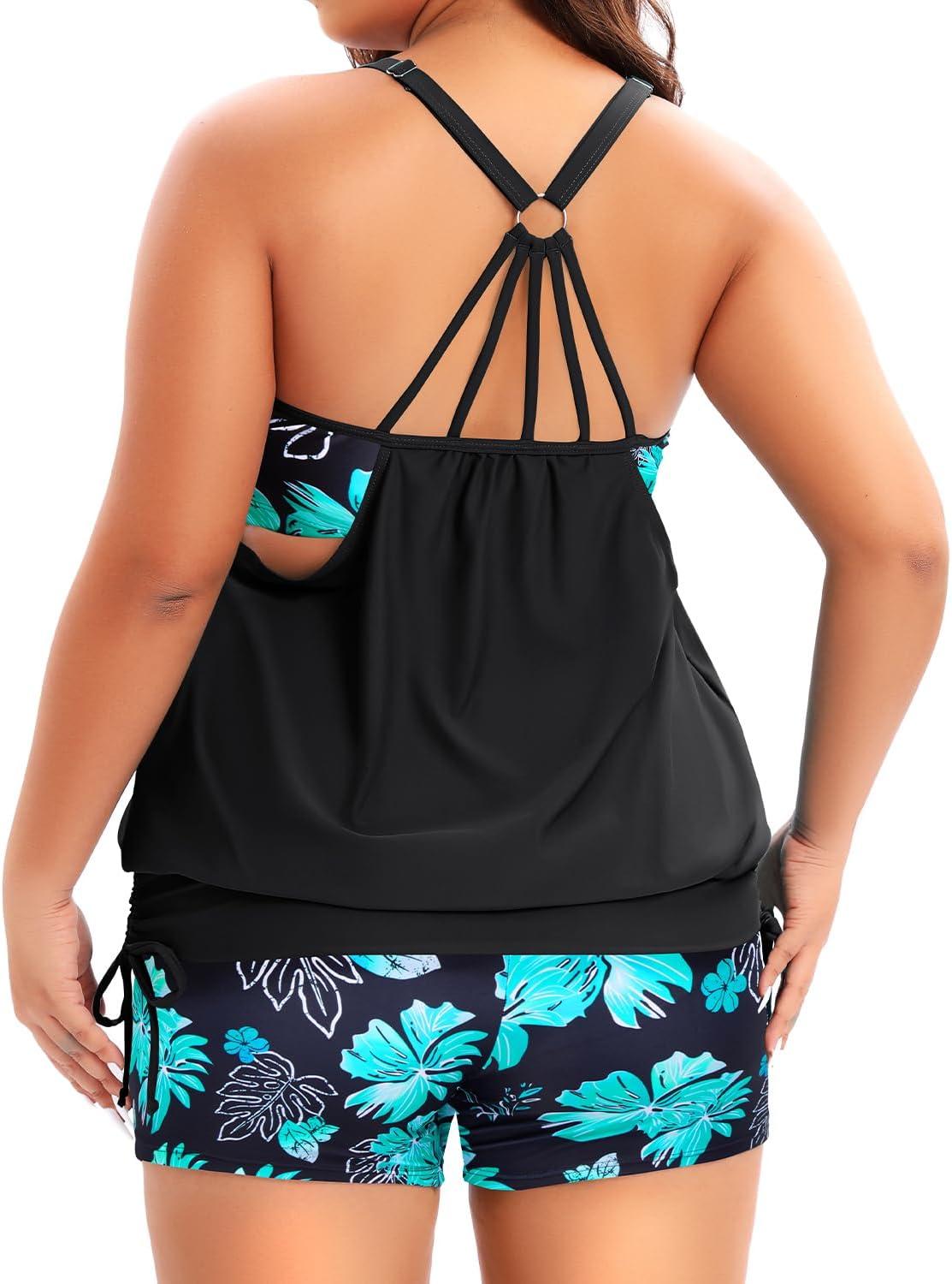 Holipick Blouson Tankini Swimsuits for Women - Two Piece Tummy Control Bathing Suit with Shorts Modest Swimwear(Black With Green Floral)