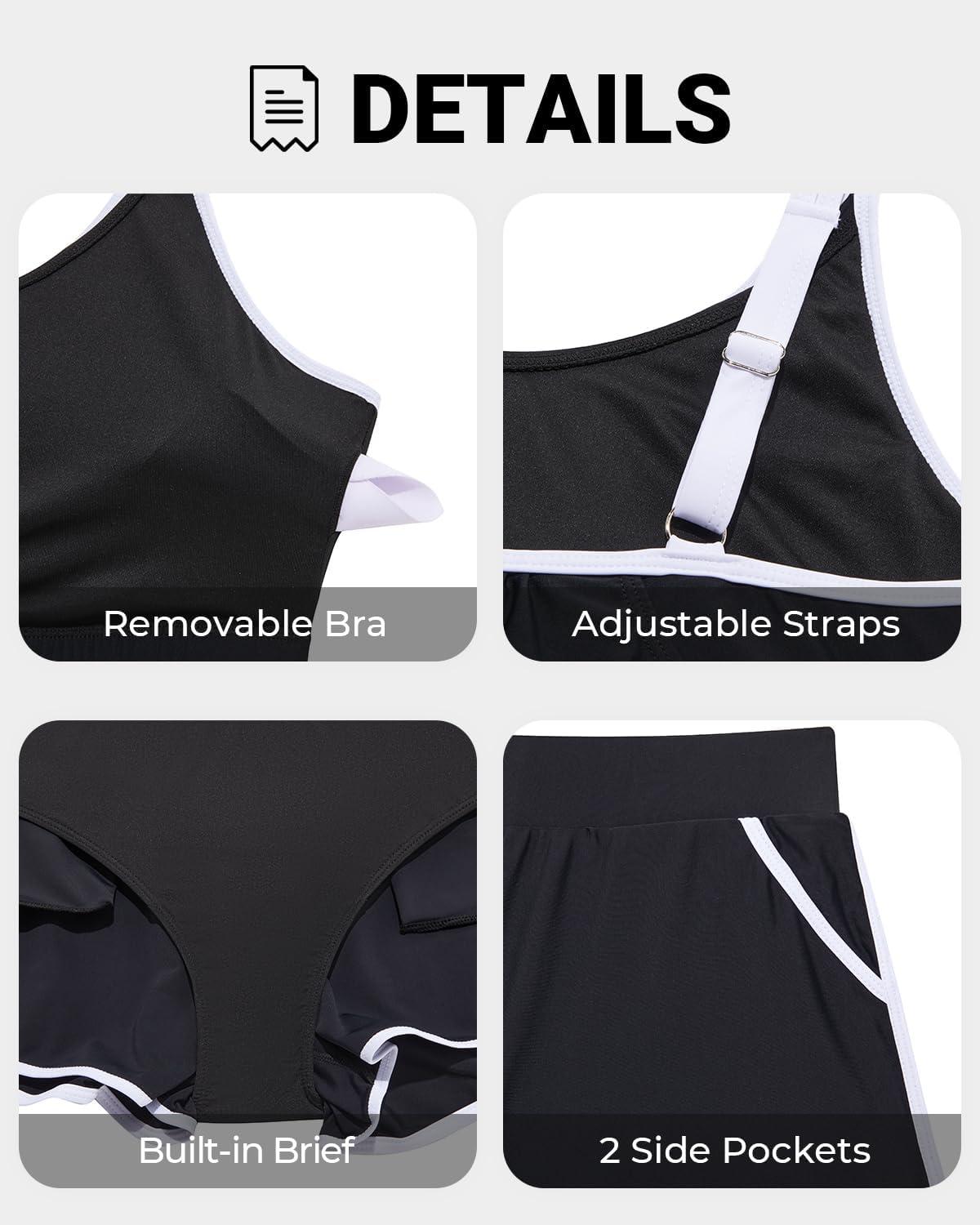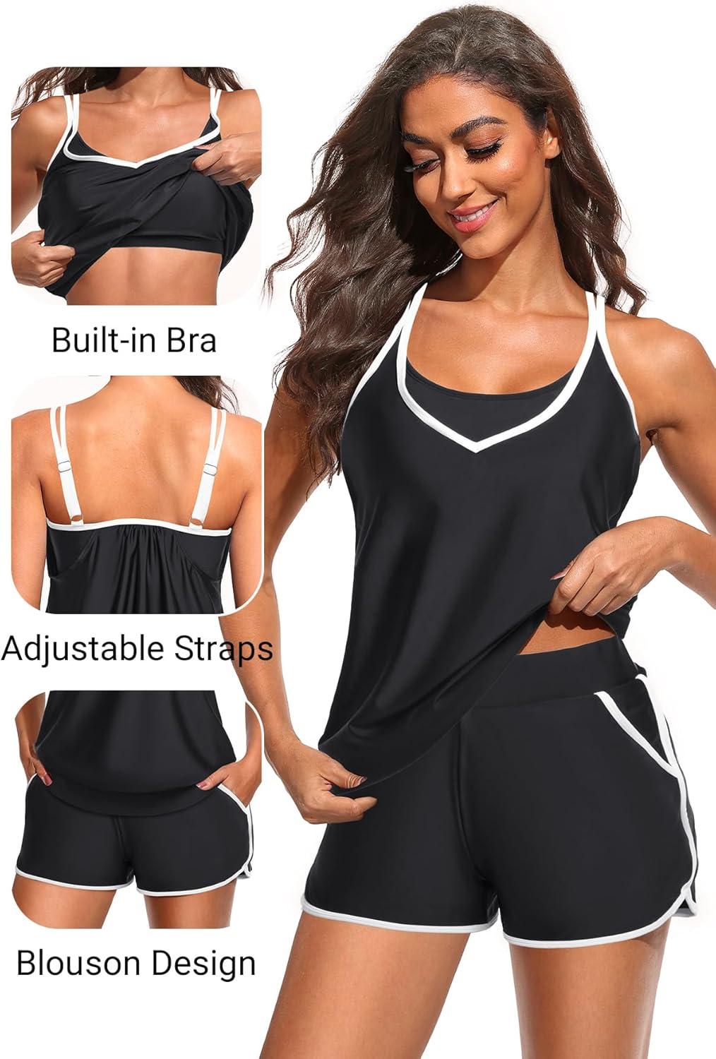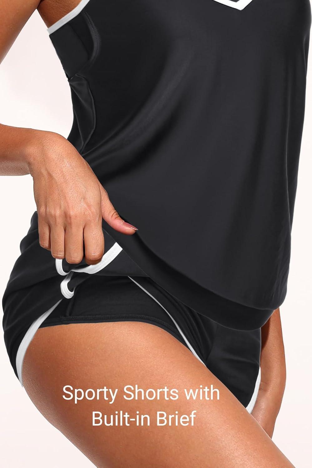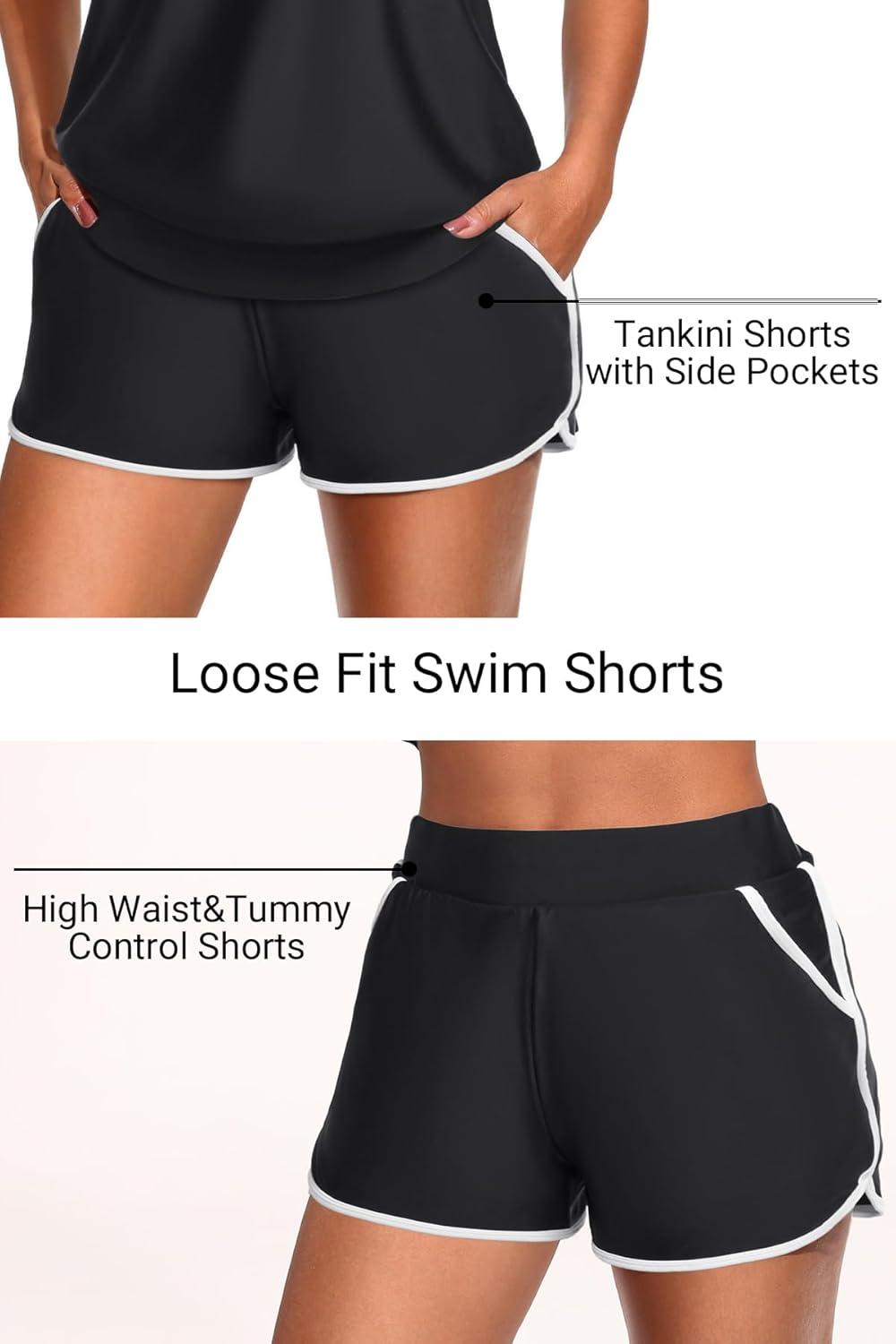 Holipick Blouson Tankini Swimsuits for Women – Two Piece Tummy Control Bathing Suit with Shorts Modest Swimwear(Black With Pocket)