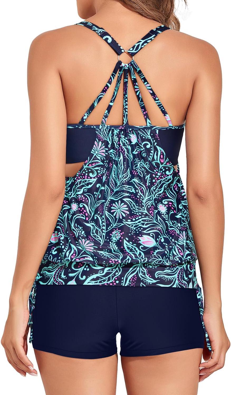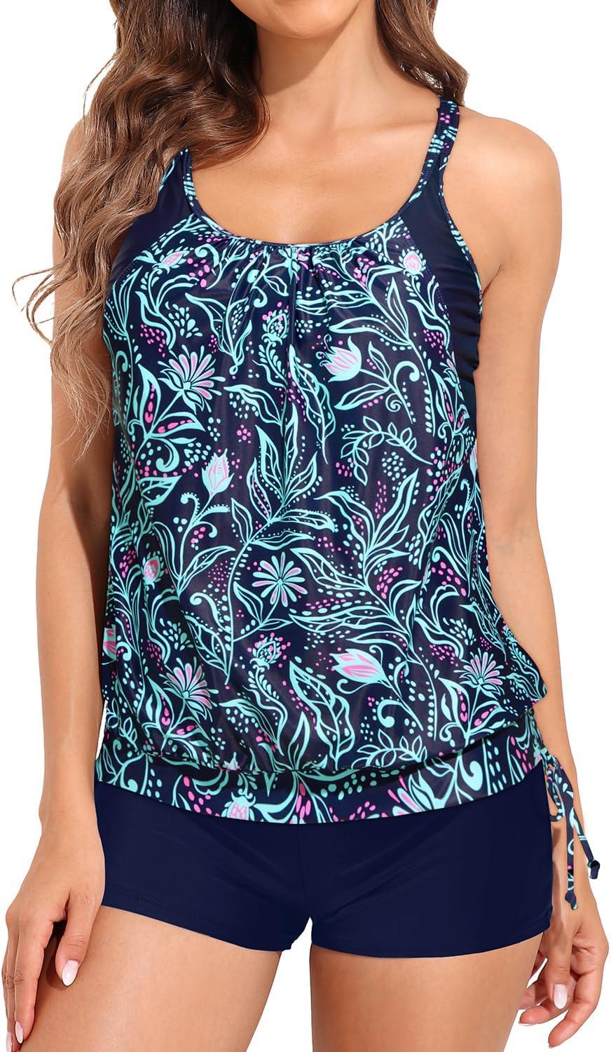 Holipick Blouson Tankini Swimsuits for Women – Two Piece Tummy Control Bathing Suit with Shorts Modest Swimwear(Blue Flower)