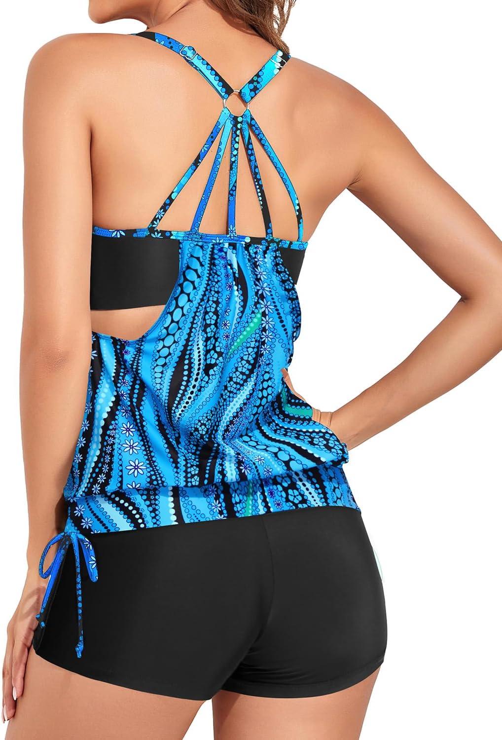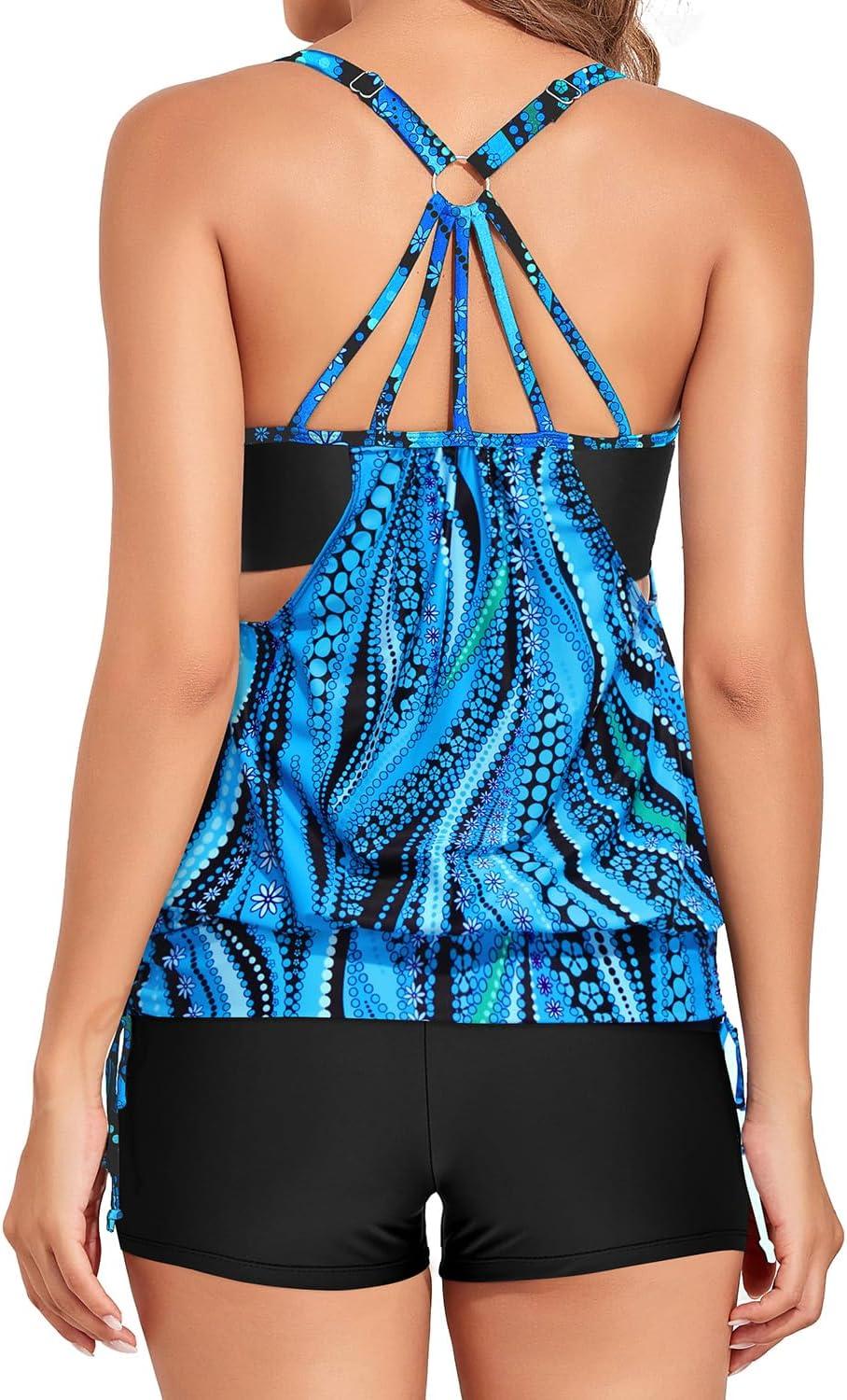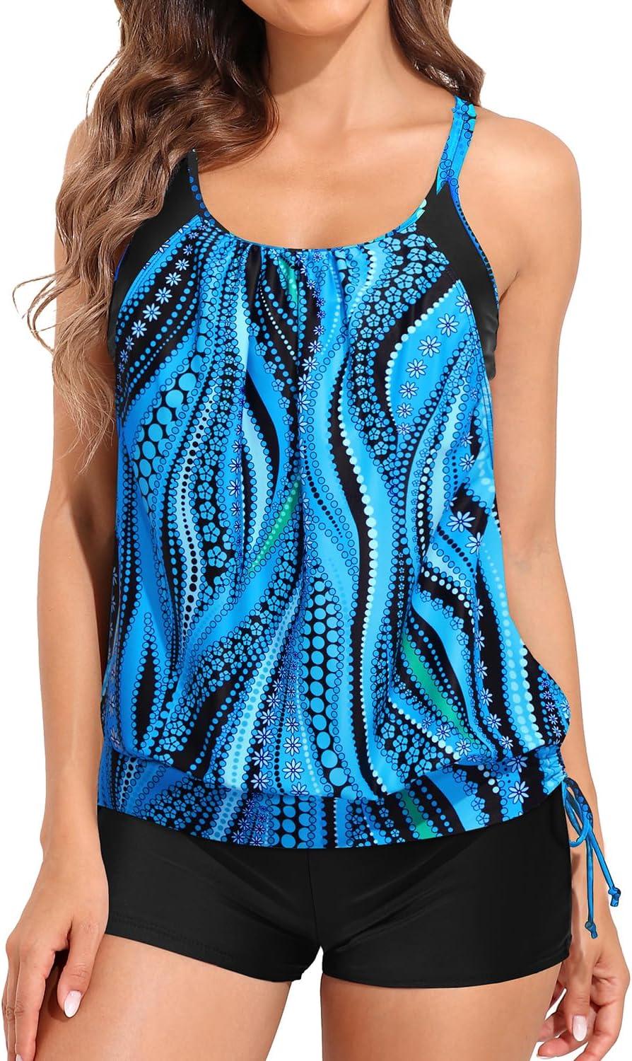 Holipick Blouson Tankini Swimsuits for Women – Two Piece Tummy Control Bathing Suit with Shorts Modest Swimwear(Blue Wavy Pattern)