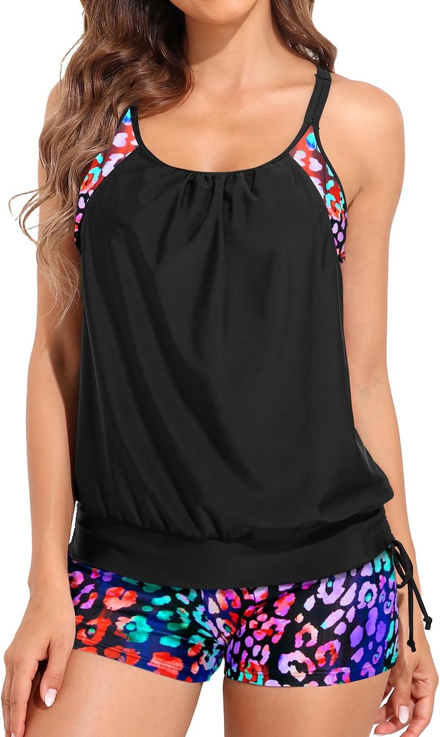 Holipick Blouson Tankini Swimsuits for Women - Two Piece Tummy Control Bathing Suit with Shorts Modest Swimwear(Color Leopard)
