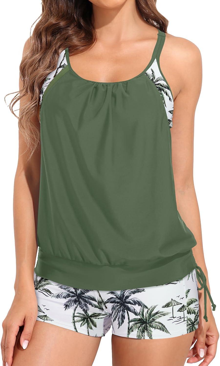 Holipick Blouson Tankini Swimsuits for Women – Two Piece Tummy Control Bathing Suit with Shorts Modest Swimwear(Green Palm Tree)