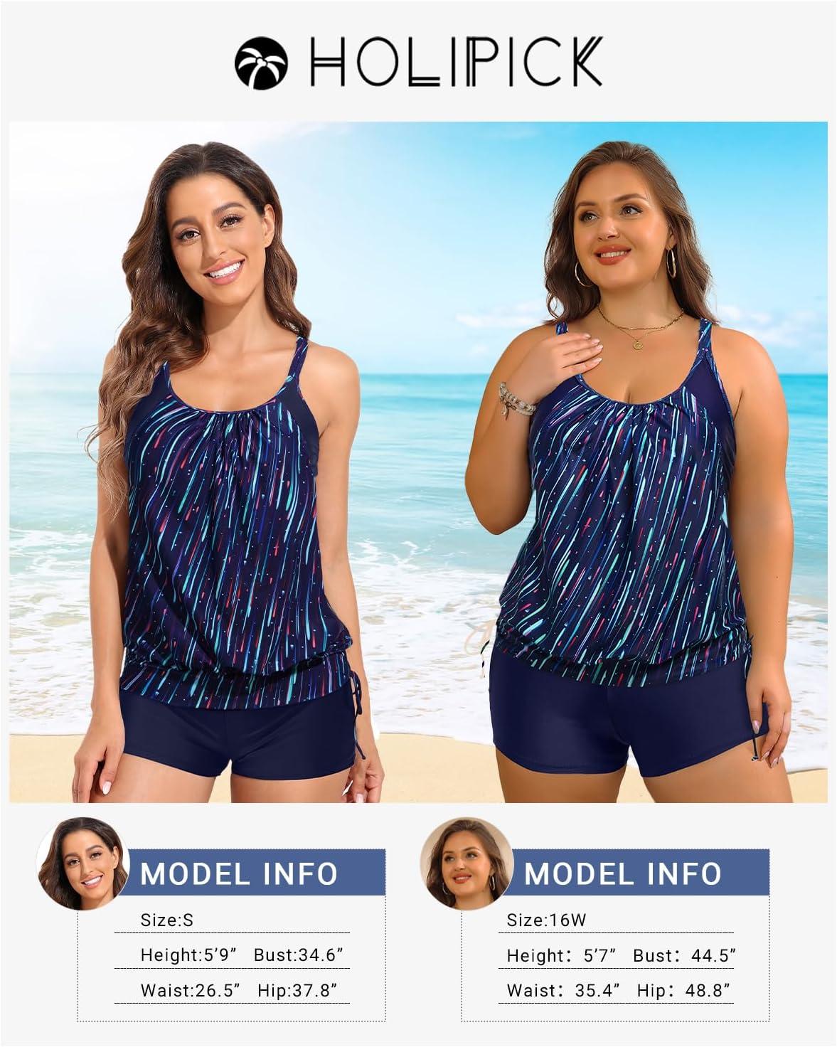 Holipick Blouson Tankini Swimsuits for Women – Two Piece Tummy Control Bathing Suit with Shorts Modest Swimwear(Navy Stripe)