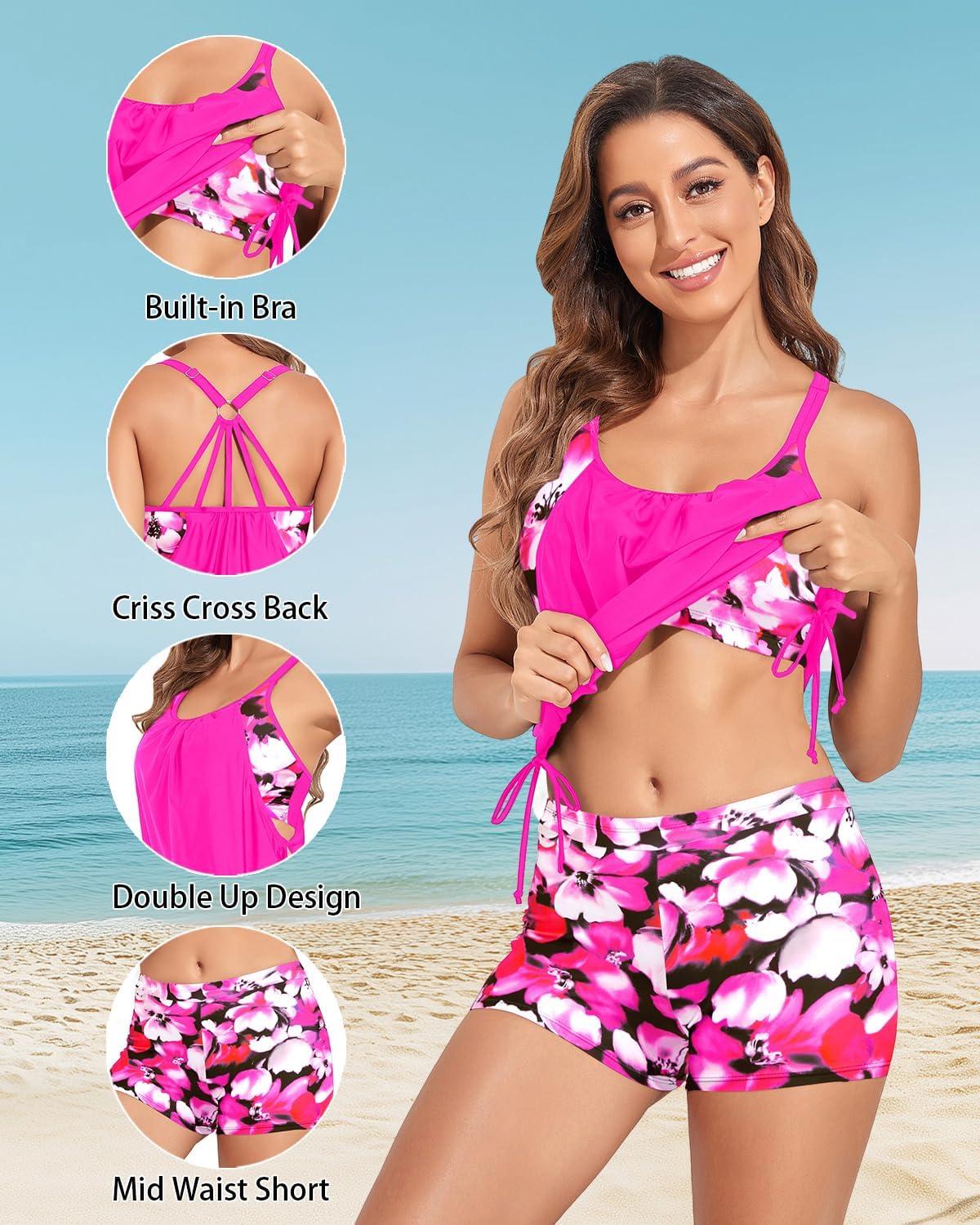 Holipick Blouson Tankini Swimsuits for Women - Two Piece Tummy Control Bathing Suit with Shorts Modest Swimwear(Pink Floral)