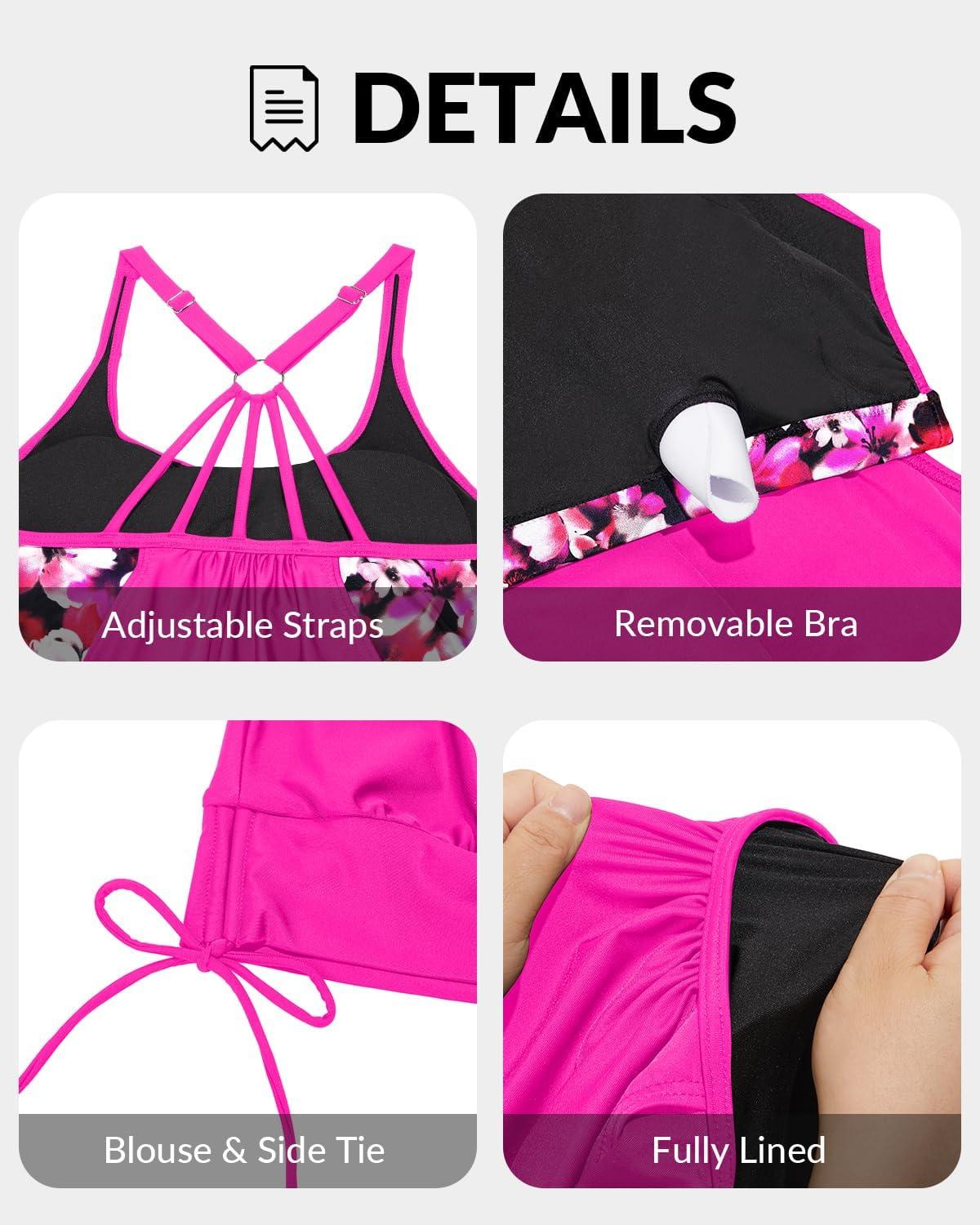 Holipick Blouson Tankini Swimsuits for Women – Two Piece Tummy Control Bathing Suit with Shorts Modest Swimwear(Pink Floral)