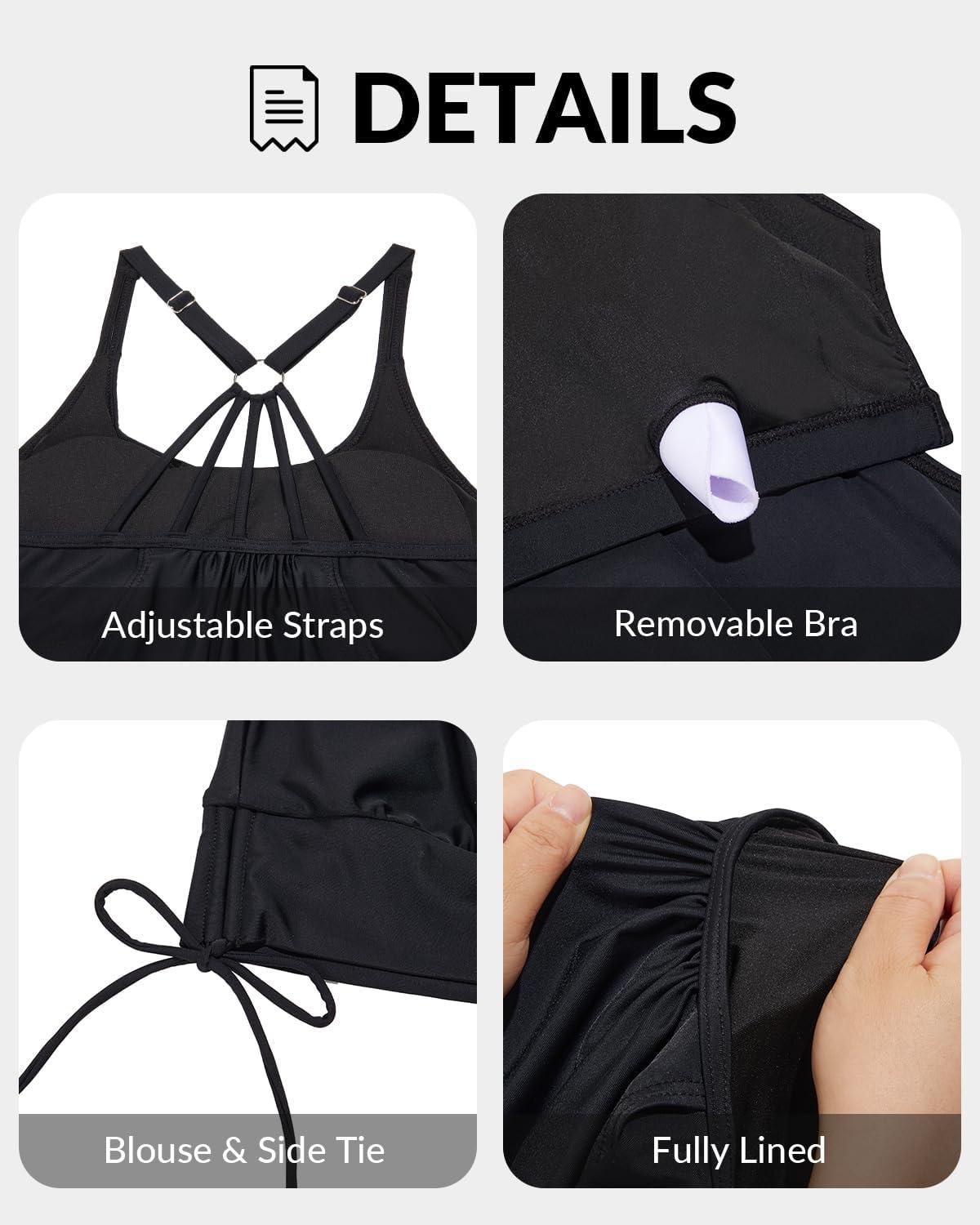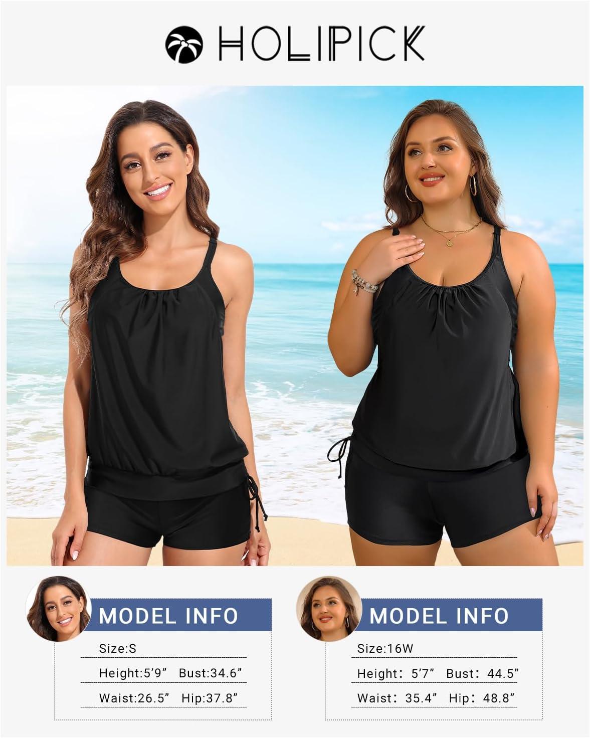 Holipick Blouson Tankini Swimsuits for Women – Two Piece Tummy Control Bathing Suit with Shorts Modest Swimwear(Pure Black)