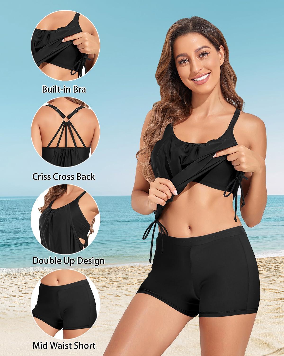 Holipick Blouson Tankini Swimsuits for Women - Two Piece Tummy Control Bathing Suit with Shorts Modest Swimwear(Pure Black)