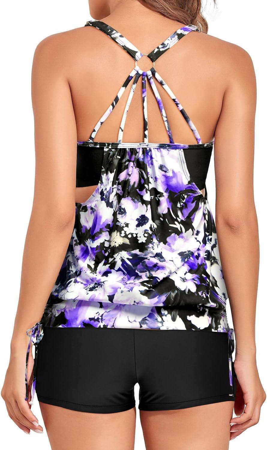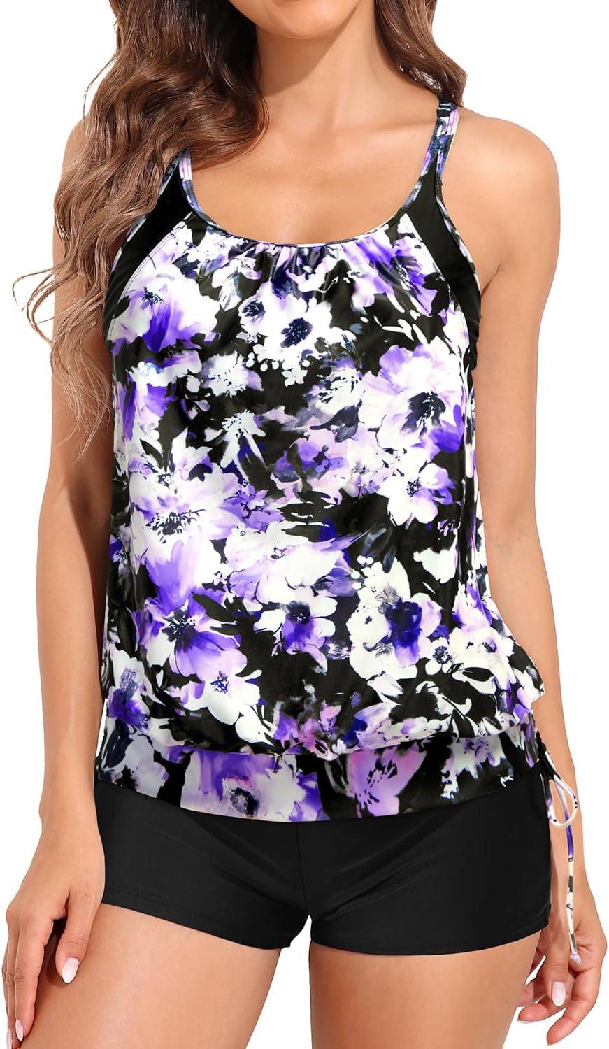 Holipick Blouson Tankini Swimsuits for Women – Two Piece Tummy Control Bathing Suit with Shorts Modest Swimwear(Purple Flowers)