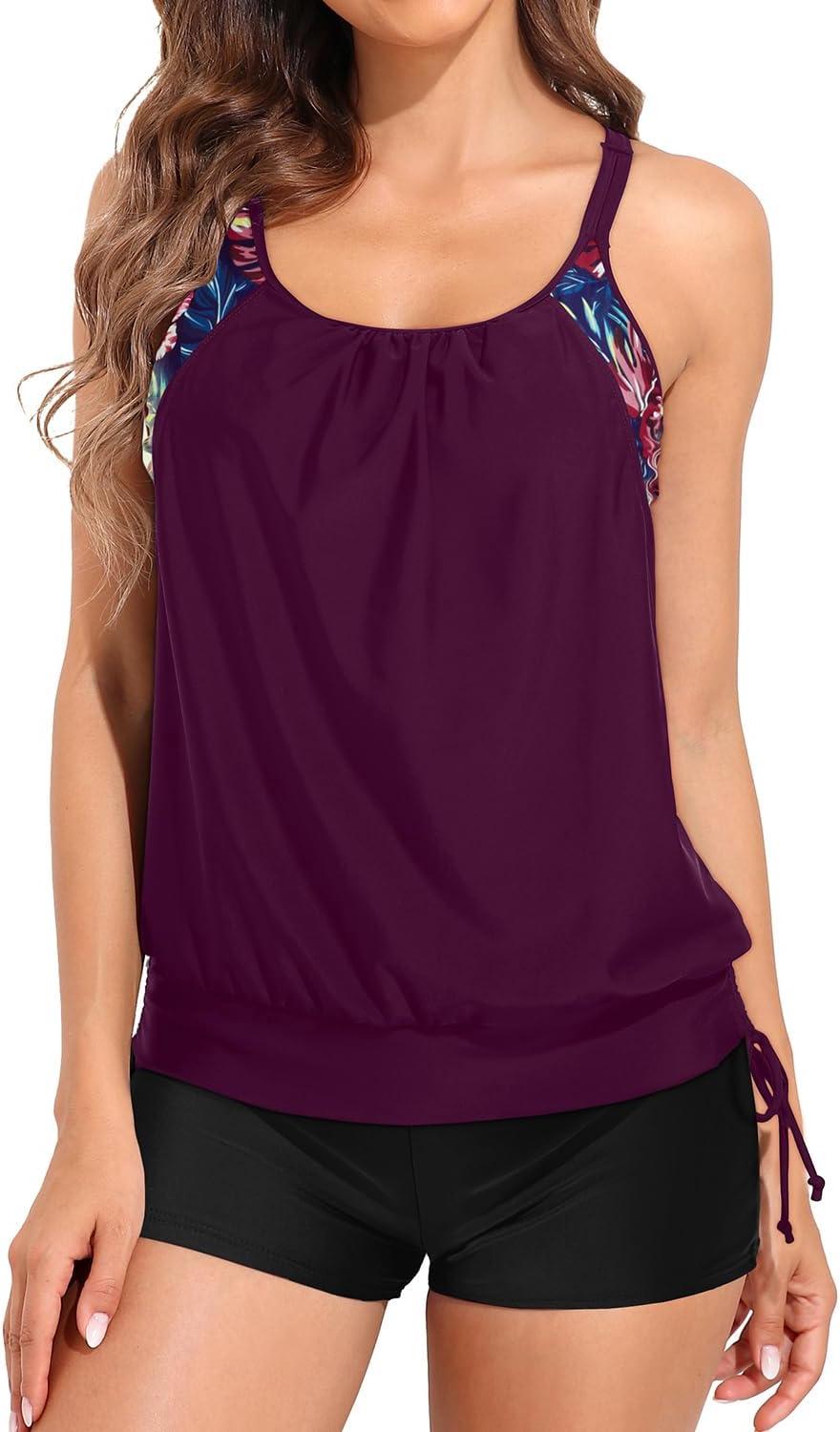 Holipick Blouson Tankini Swimsuits for Women – Two Piece Tummy Control Bathing Suit with Shorts Modest Swimwear(Purple Floral)