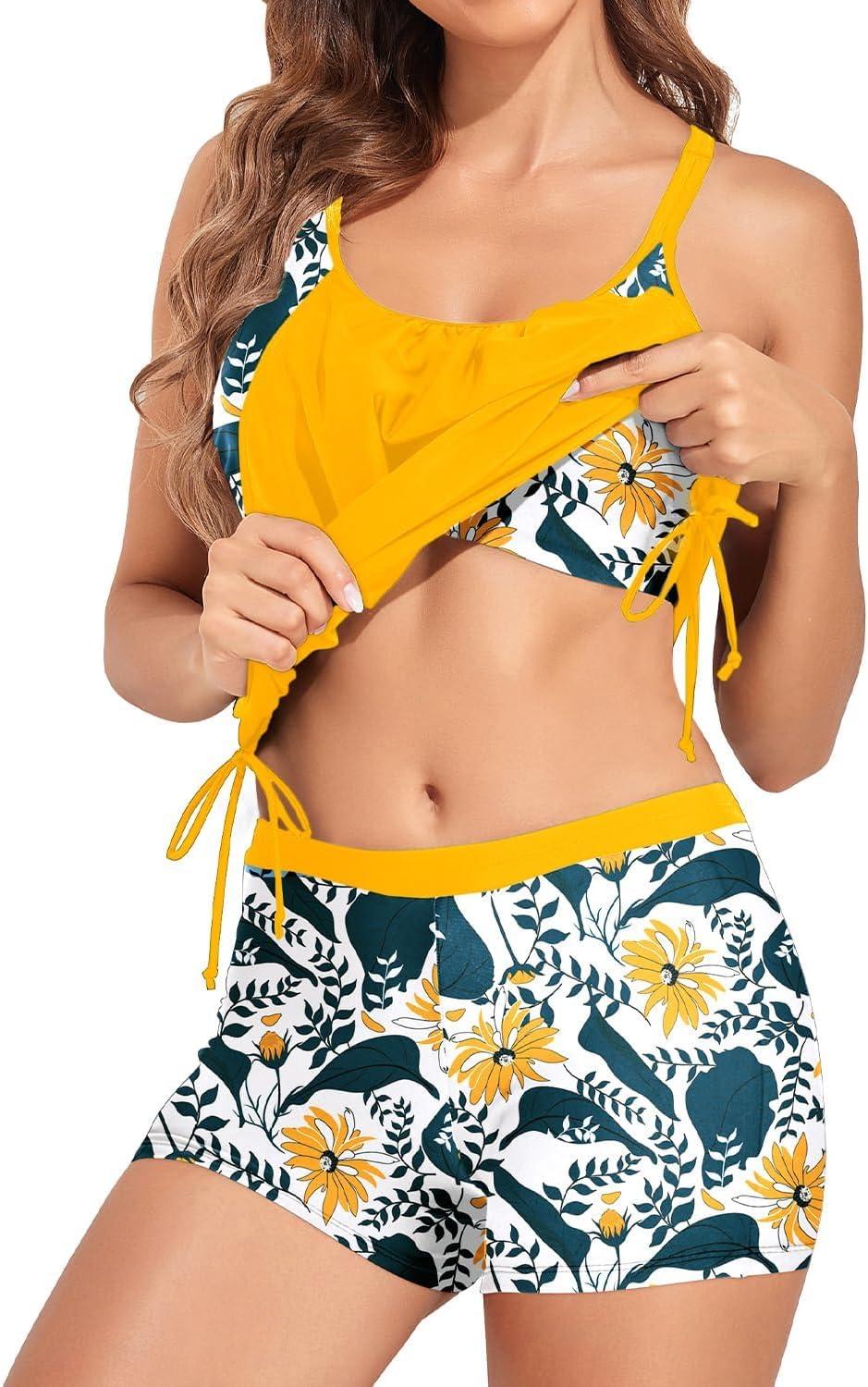Holipick Blouson Tankini Swimsuits for Women - Two Piece Tummy Control Bathing Suit with Shorts Modest Swimwear(Yellow Floral)