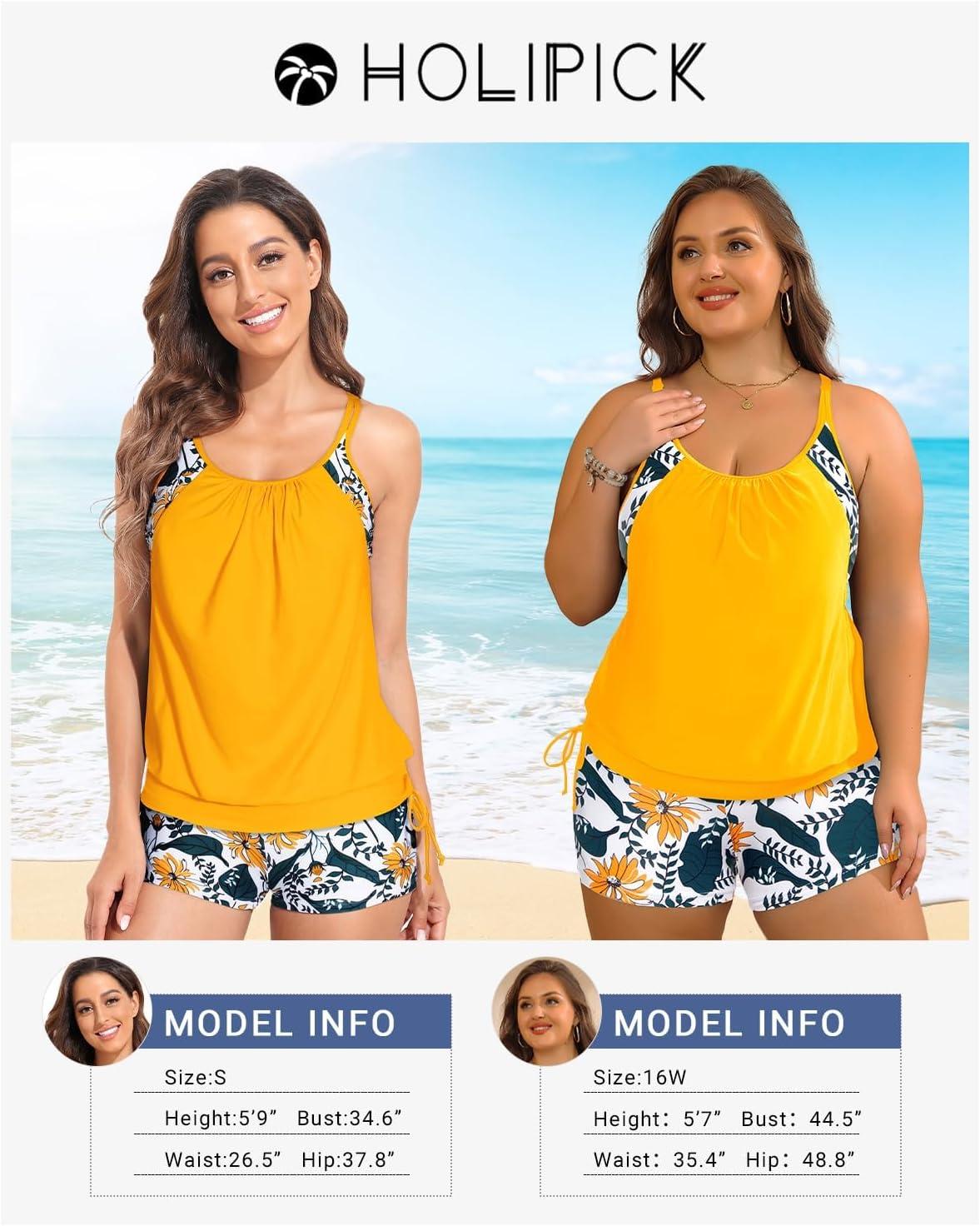 Holipick Blouson Tankini Swimsuits for Women – Two Piece Tummy Control Bathing Suit with Shorts Modest Swimwear(Yellow Floral)