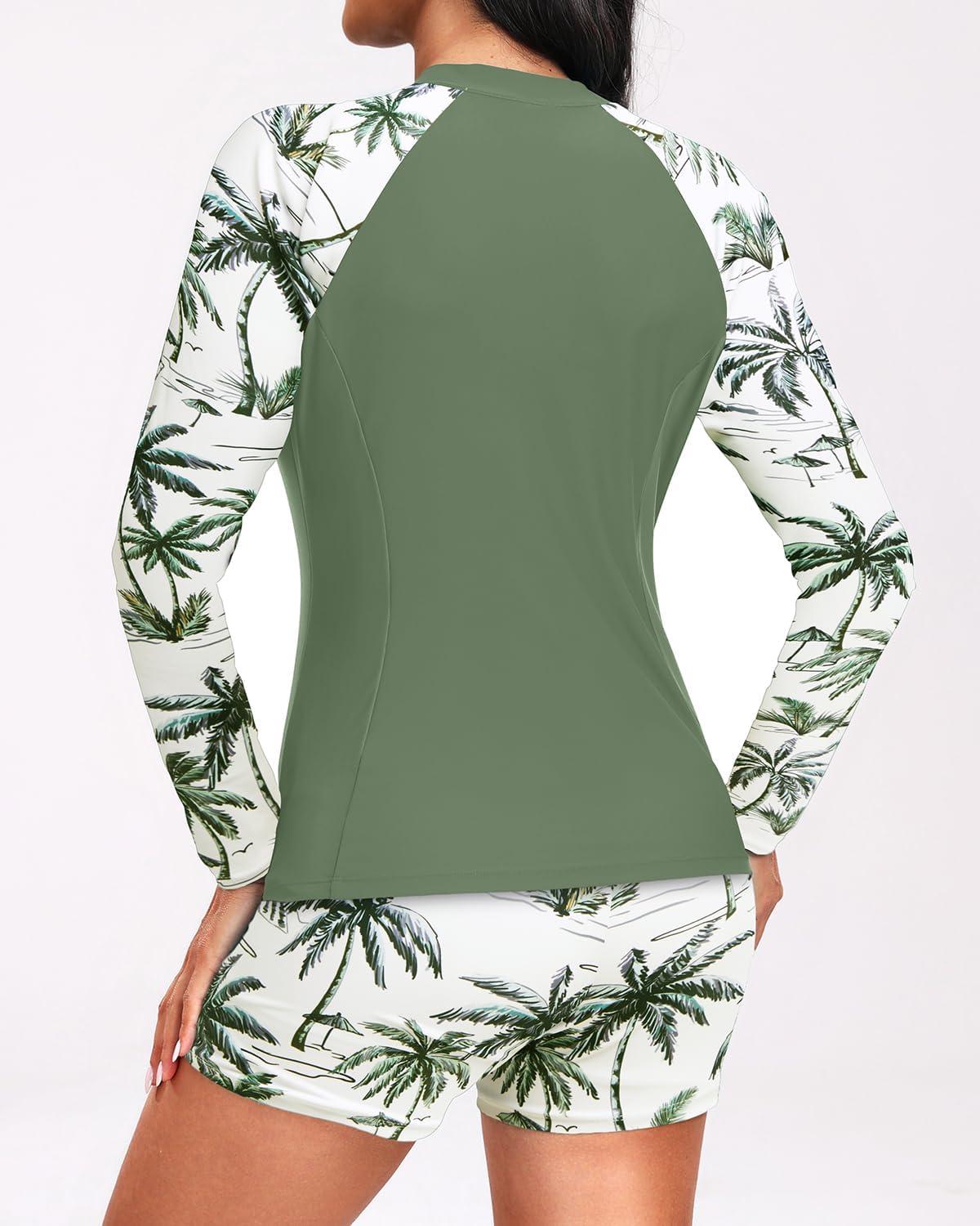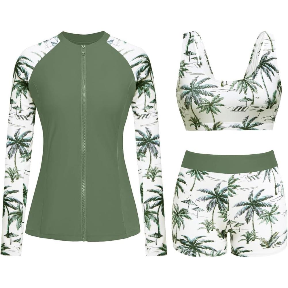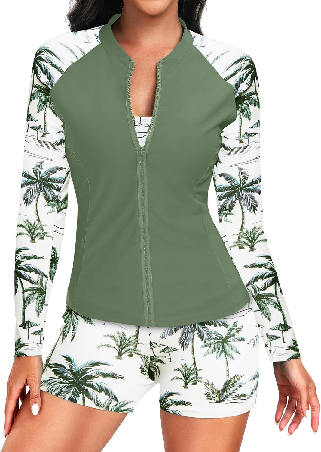 Holipick Long Sleeve Swimsuits for Women - 3 Piece Rash Guard with Shorts Zipper SPF Swim Shirt with Built in Bra(Green Palm Tree)