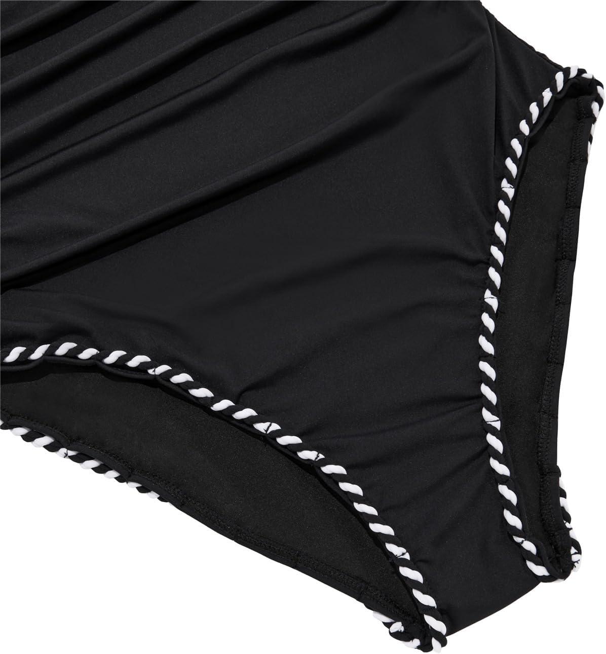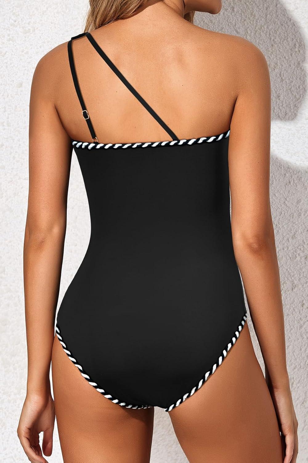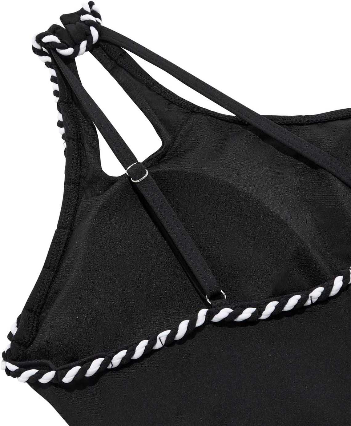 Holipick One Shoulder One Piece Swimsuit for Women Tummy Control Bathing Suits Modest Full Coverage Keyhole Swimwear(Ropes-black and White)