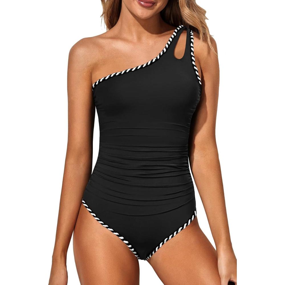 Holipick One Shoulder One Piece Swimsuit for Women Tummy Control Bathing Suits Modest Full Coverage Keyhole Swimwear(Colorful Black)