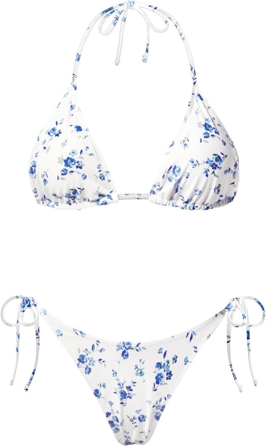 Holipick Two Piece Triangle Bikini Sets for Women String Bathing Suit Halter Top with Side Tie Bikini Bottom(White and Blue Floral)