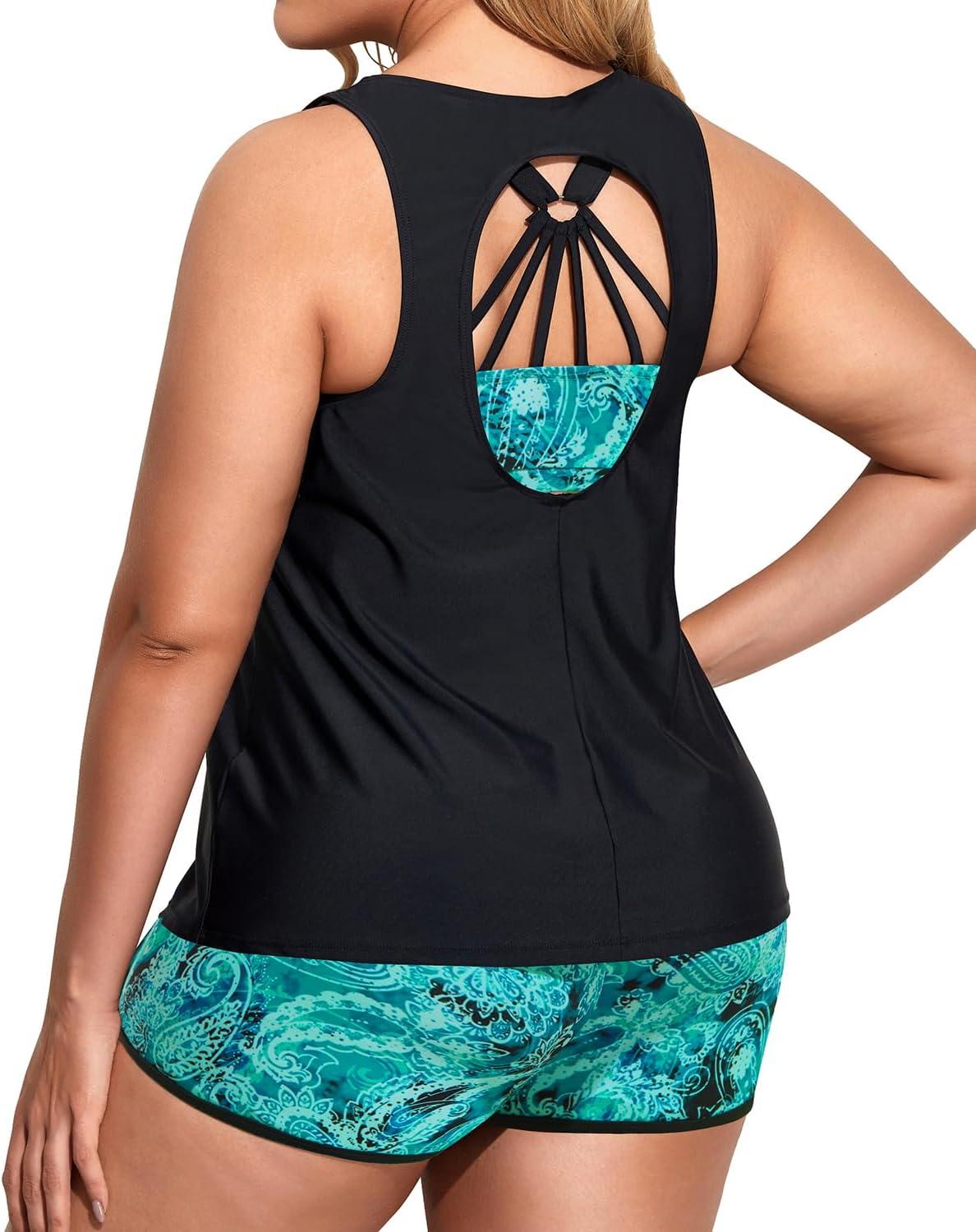 Holipick Women Plus Size 3 Piece Tankini Swimsuits Athletic Bathing Suits with Shorts(Black With Blue Paisley)