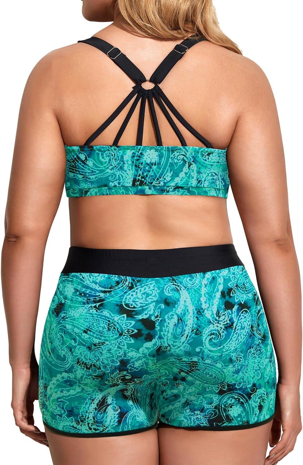 Holipick Women Plus Size 3 Piece Tankini Swimsuits Athletic Bathing Suits with Shorts(Aqua Blue and Floral)