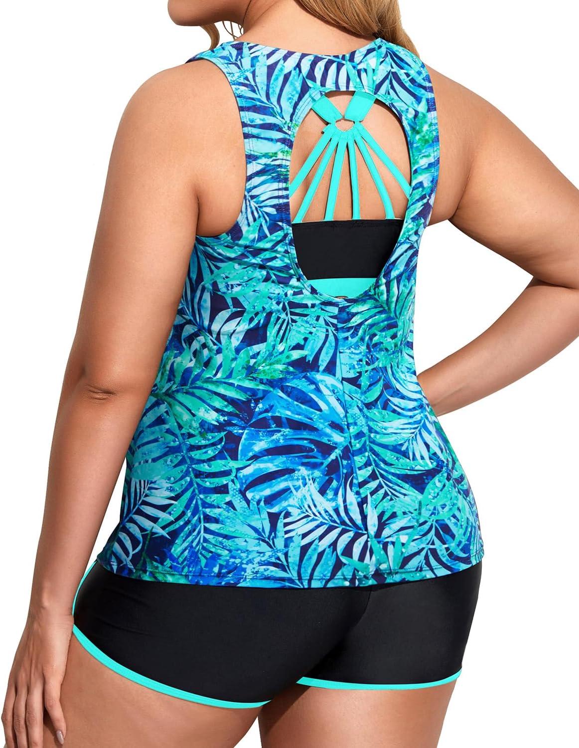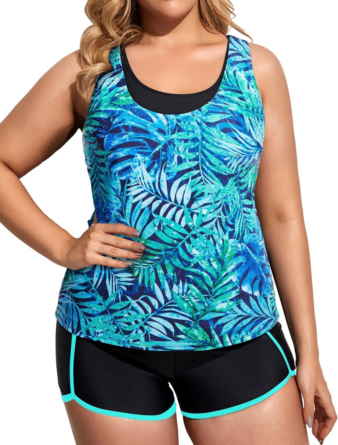 Holipick Women Plus Size 3 Piece Tankini Swimsuits Athletic Bathing Suits with Shorts(Blue Leaves)