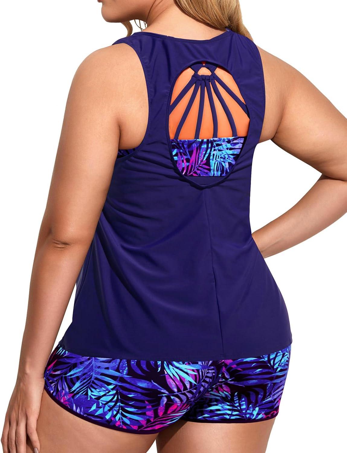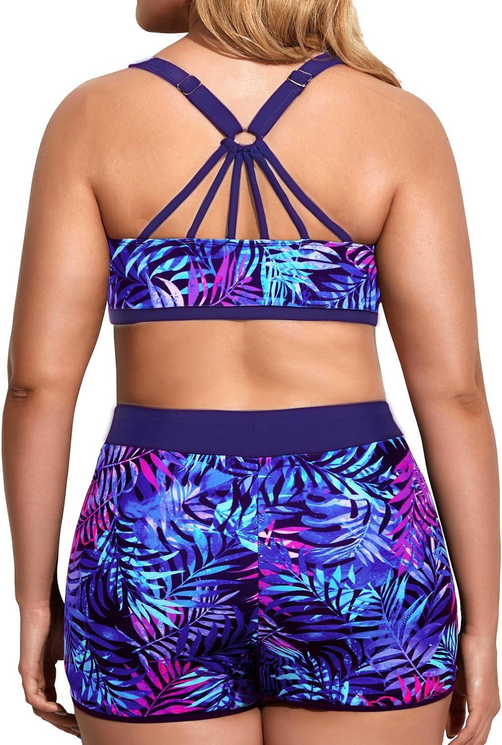 Holipick Women Plus Size 3 Piece Tankini Swimsuits Athletic Bathing Suits with Shorts(Blue Purple Leaves)