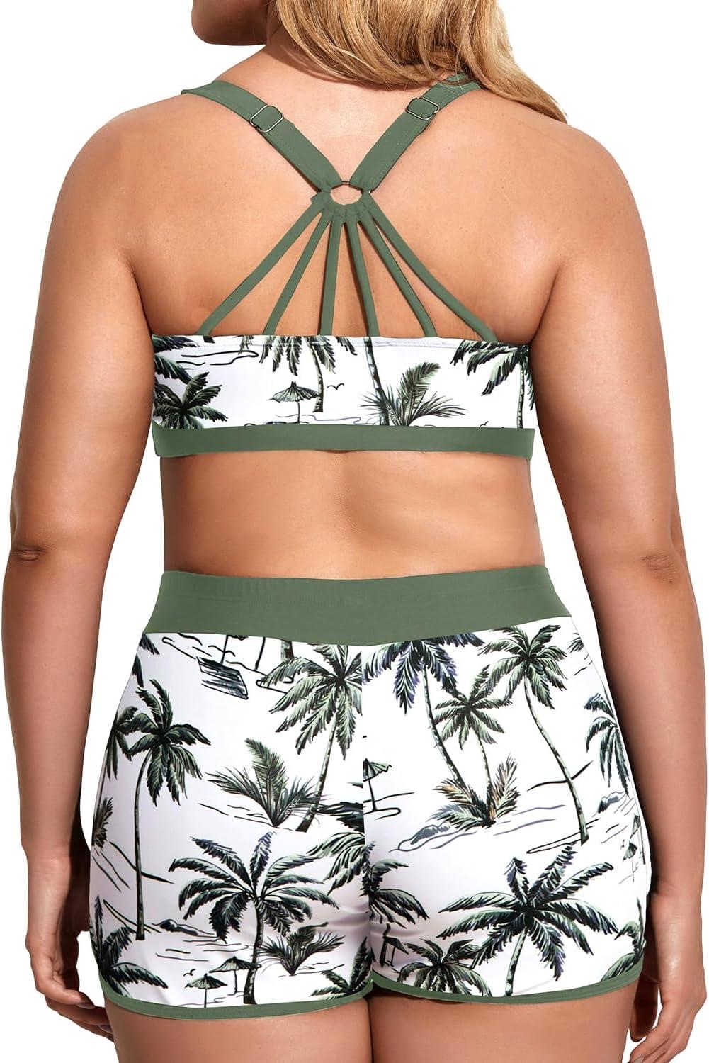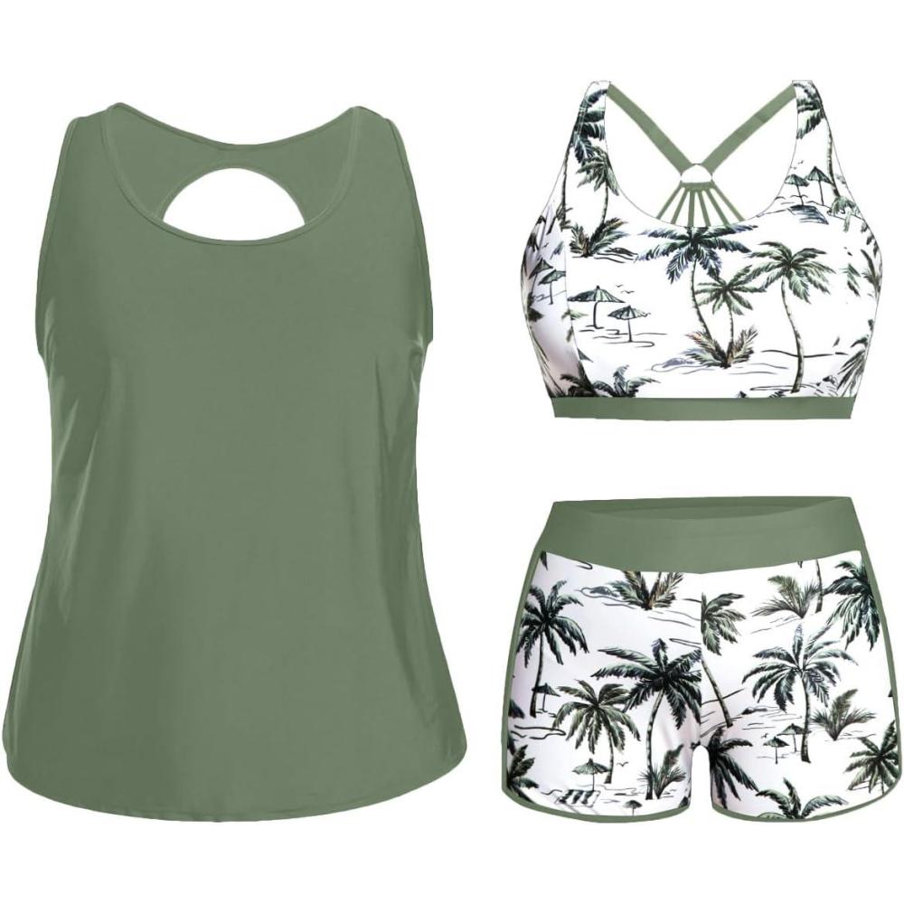 Holipick Women Plus Size 3 Piece Tankini Swimsuits Athletic Bathing Suits with Shorts(Green Palm Tree)