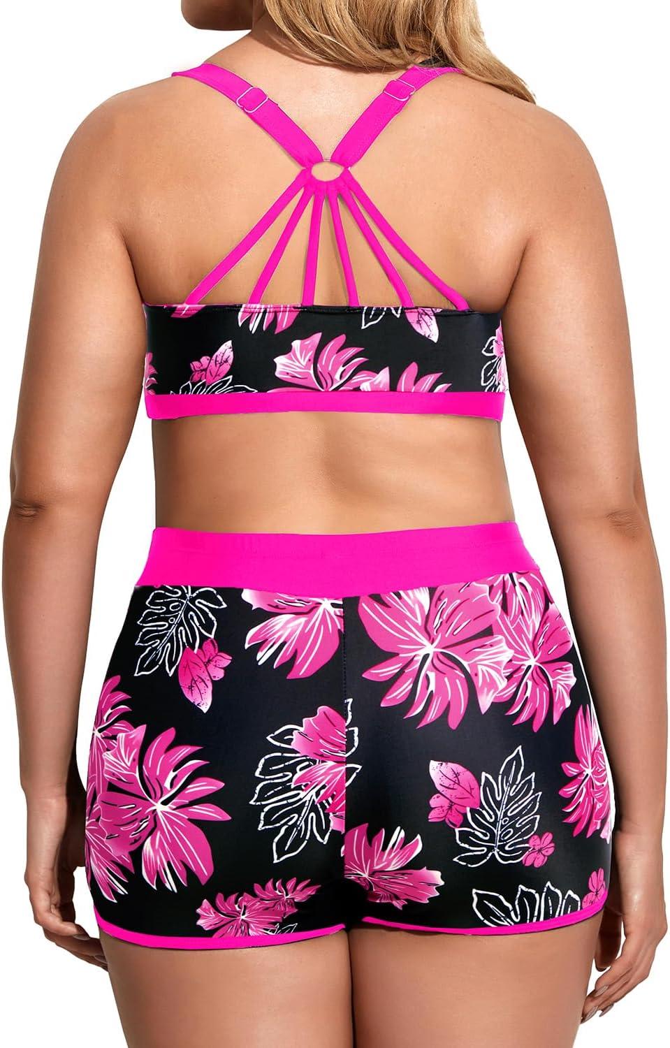Holipick Women Plus Size 3 Piece Tankini Swimsuits Athletic Bathing Suits with Shorts(Pink Floral)