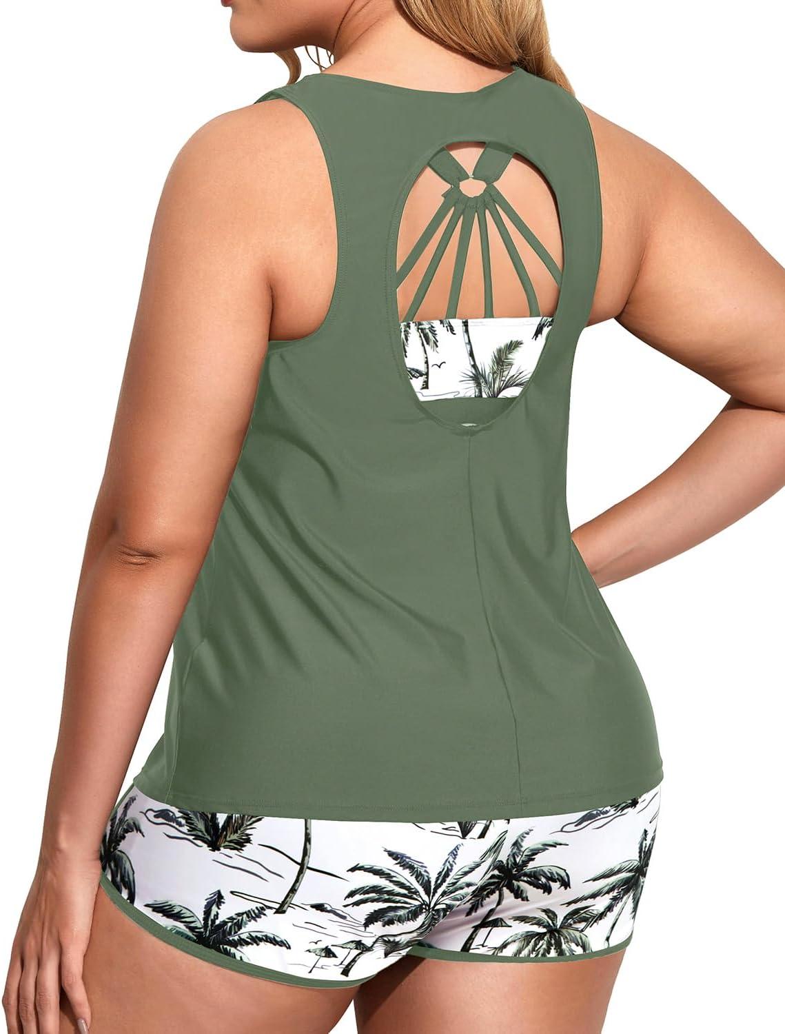 Holipick Women Plus Size 3 Piece Tankini Swimsuits(Green Palm Tree)
