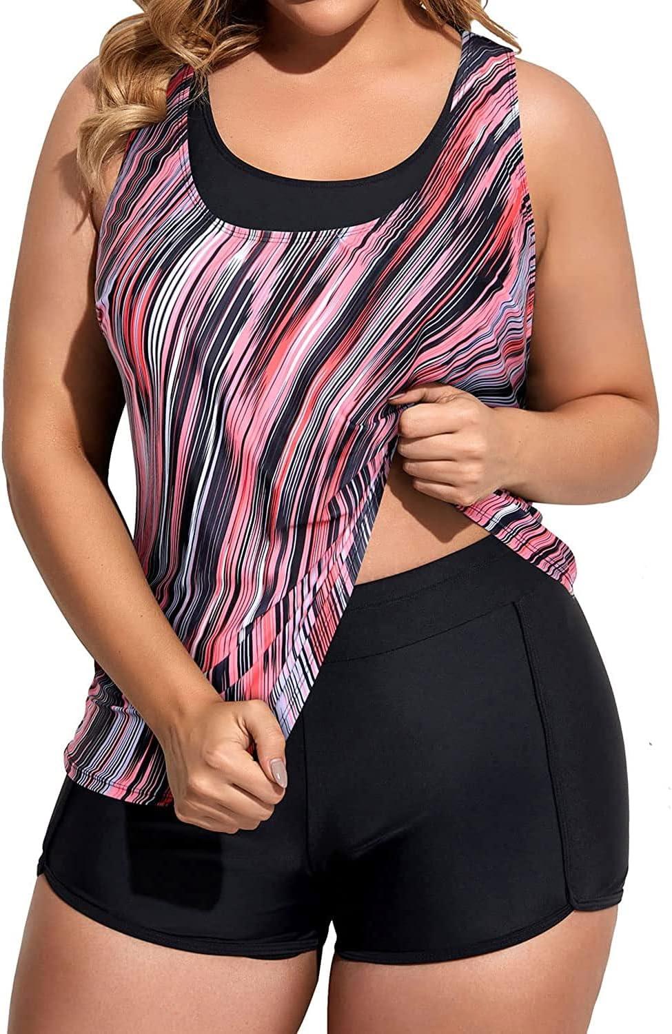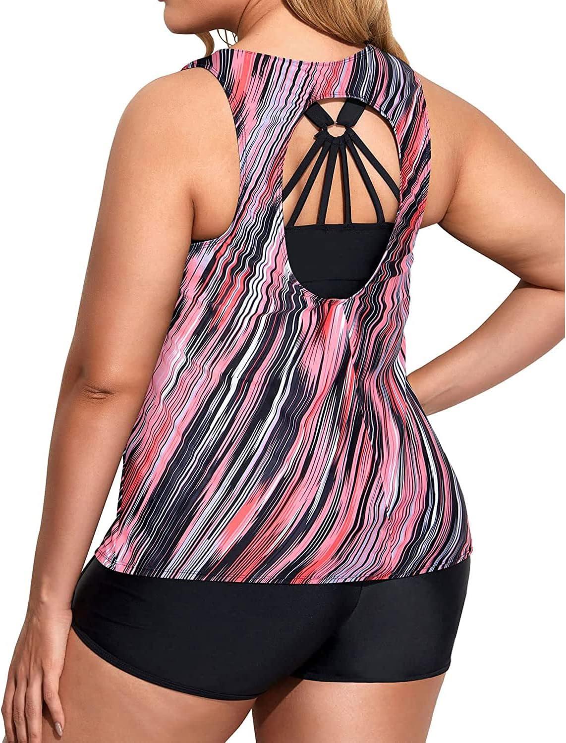 Holipick Women Plus Size 3 Piece Tankini Swimsuits(Pink Striped)