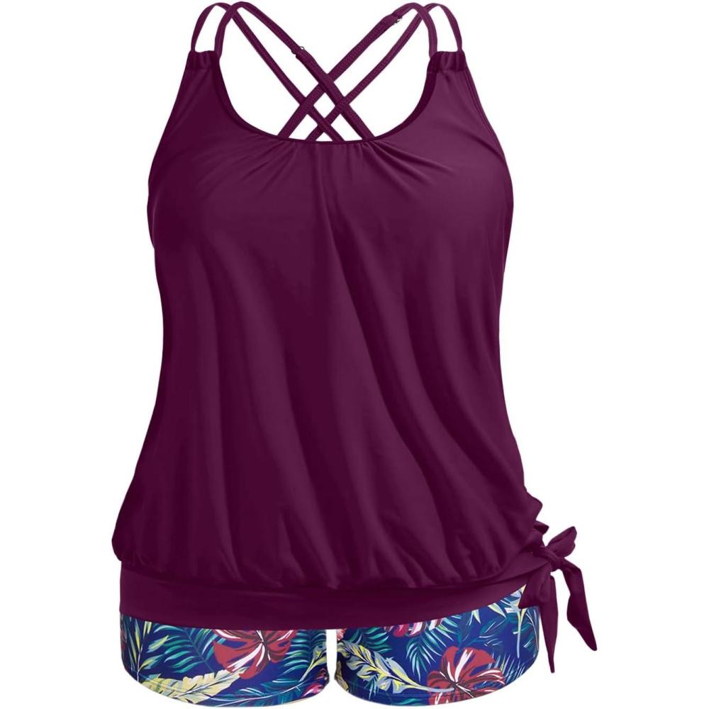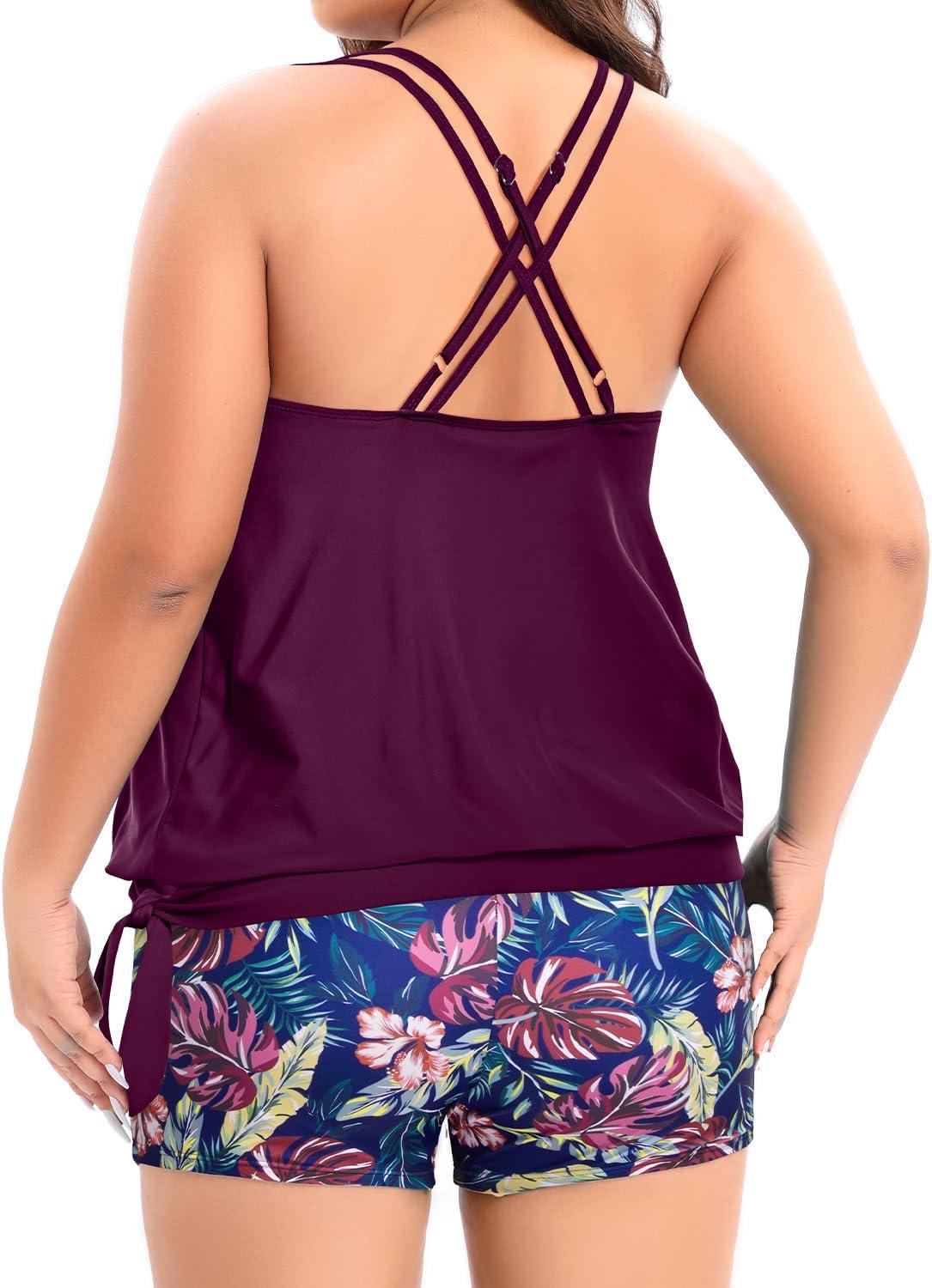 Holipick Women Plus Size Two Piece Tankini Swimsuit Tummy Control Bathing Suits Blouson Tankini Top with Boy Shorts(Purple Leaves)