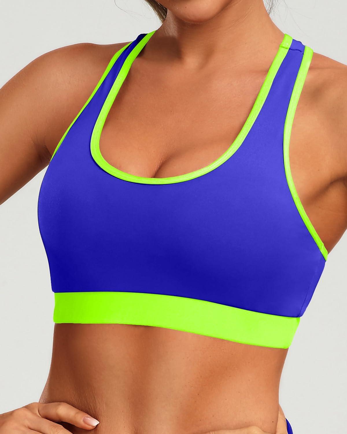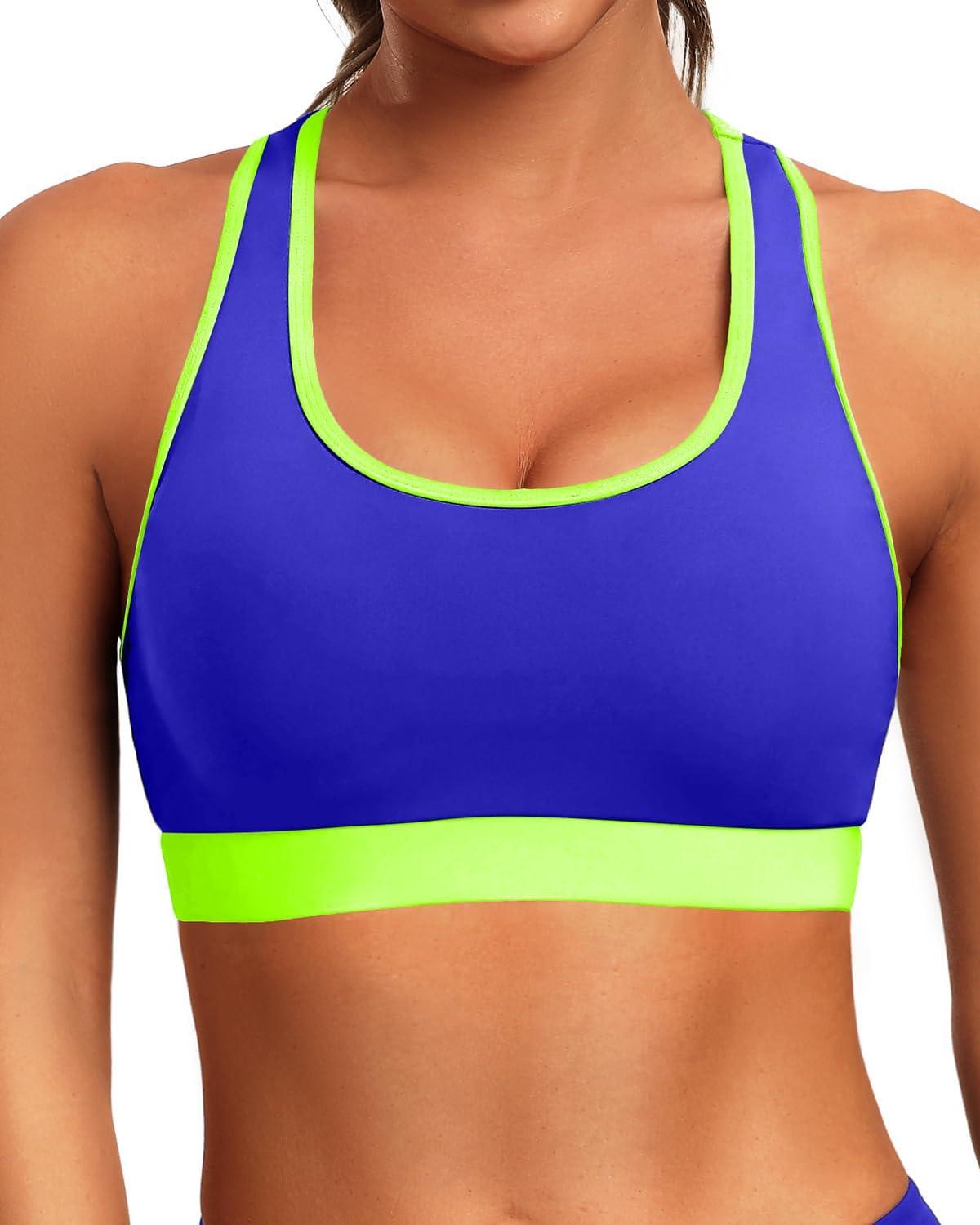 Holipick Women's Sports Bra Bikini Tops Racerback Swim Top Scoop Neck Bathing Suits Top Modest Padded Crop Tops Swimsuit Only(Blue-neon Green)