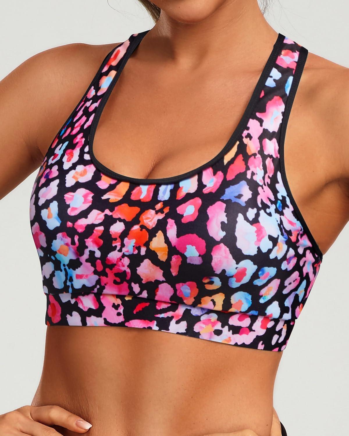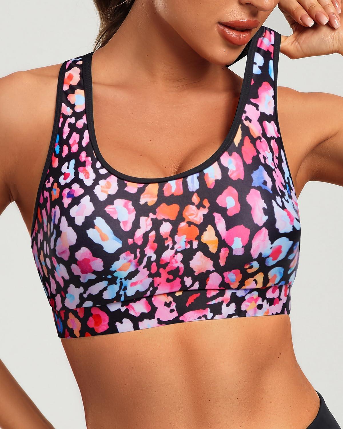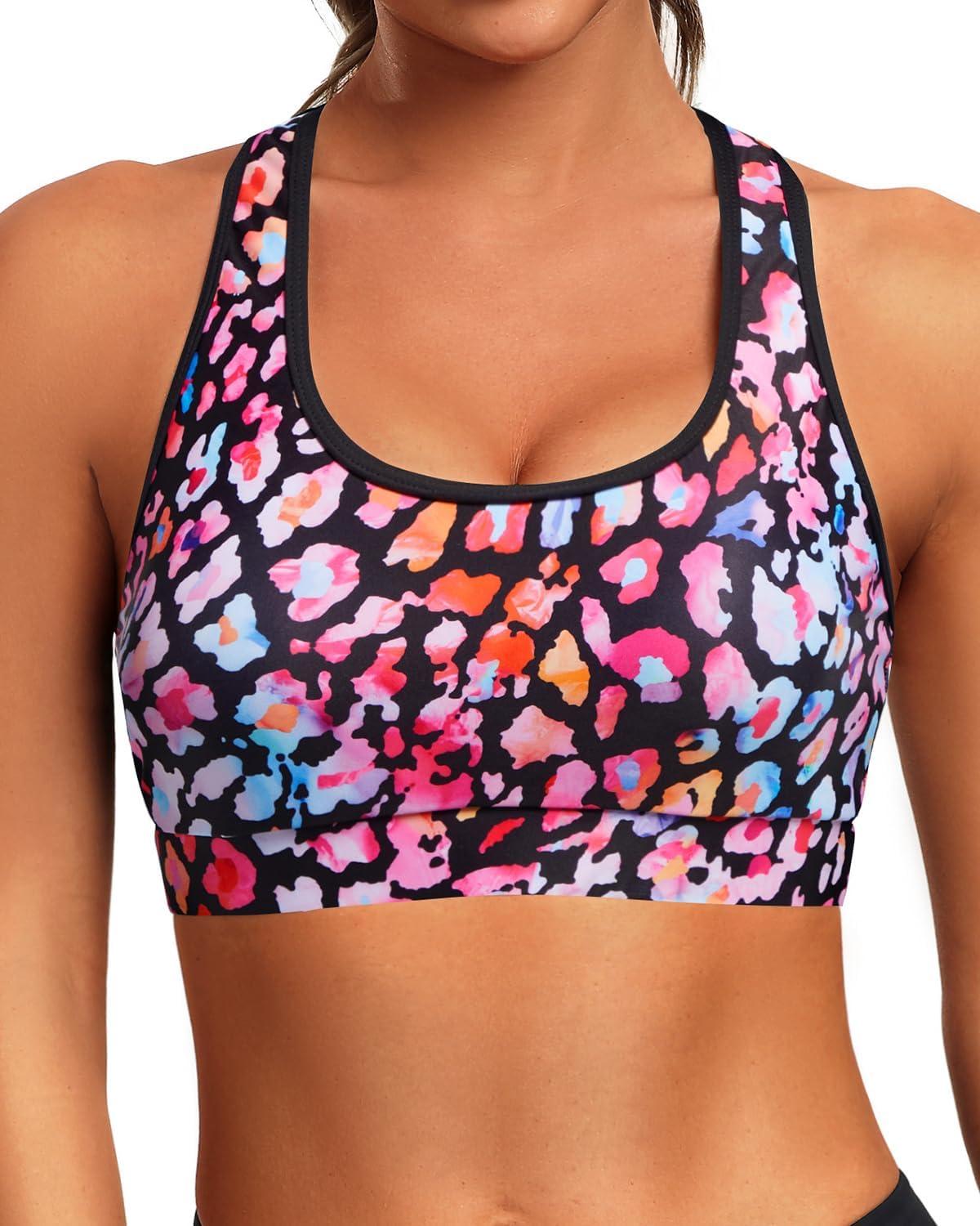 Holipick Women's Sports Bra Bikini Tops Racerback Swim Top Scoop Neck Bathing Suits Top Modest Padded Crop Tops Swimsuit Only(Colorful Leopard)